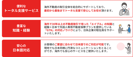 GTN Koreaは、世界各国で不動産賃貸仲介業を展開する株式会社エイブルとの協力体制と、韓国の国家資格「公認仲介士(日本の宅地建物取引士相当)」による厳格な物件審査のもと、以下のソリューションを提供します。