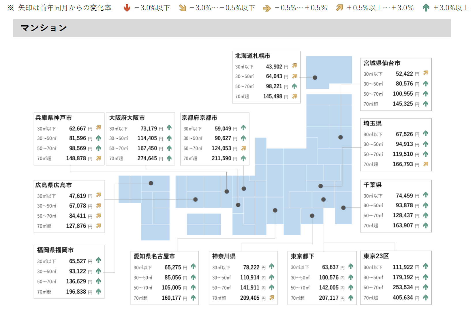 ●マンションは、ファミリー向きが7カ月連続して全エリアで前年同月を上回る。シングル向きでは東京23区が22カ月連続、大阪市が20カ月連続で2015年1月以降最高値を更新。名古屋市は3カ月連続で全面積帯が最高値を更新した。