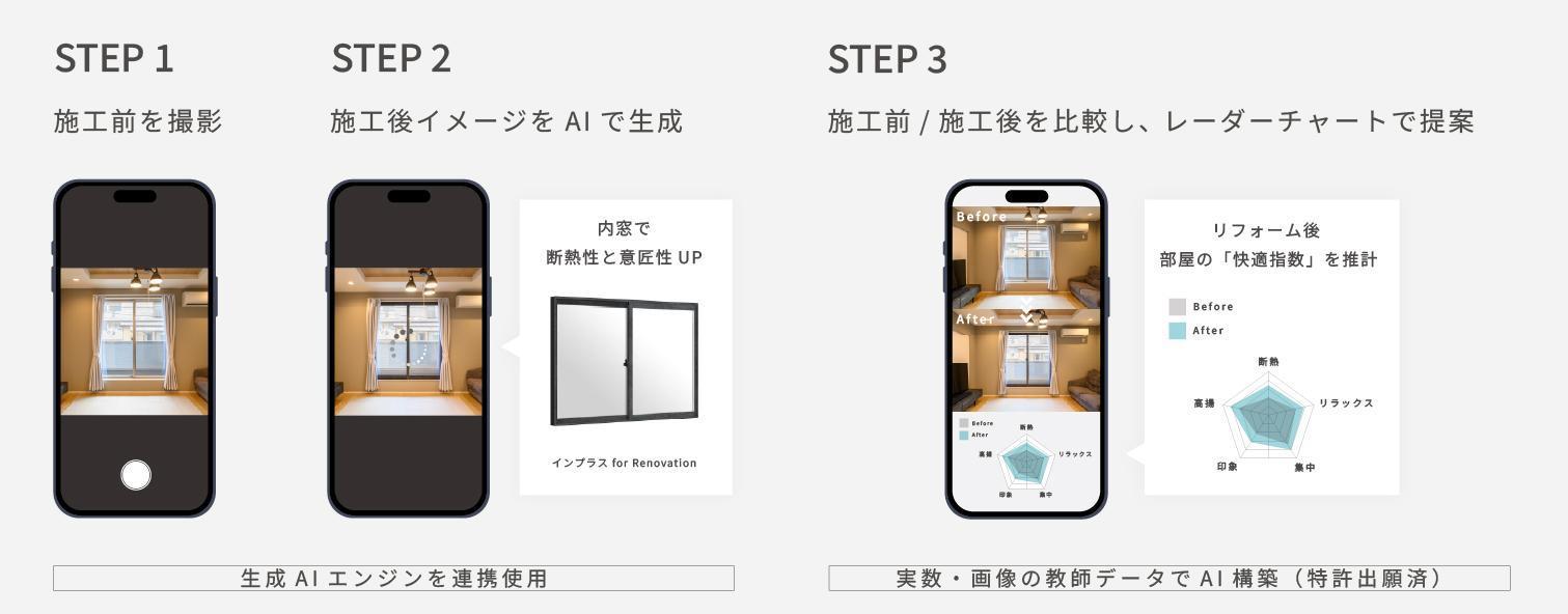 既存の部屋の写真から窓改修後のリラックス度や集中度をAI予測する特許出願済みの技術を活用し、納得感のある窓選びをサポート