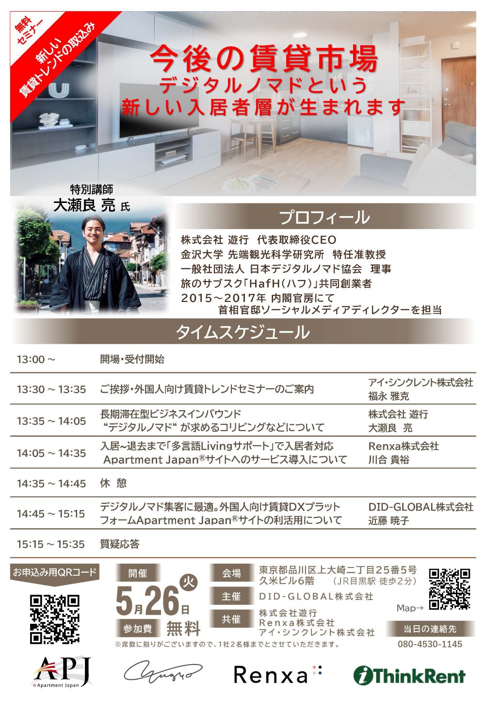 外国人向け賃貸契約プラットフォーム「Apartment Japan®(アパートメントジャパン、以下「Apartment Japan」)」を運営するDID-GLOBAL株式会社(本社:大阪市中央区、代表取締役:近藤暁子、以下「DID-GLOBAL」)は、外国人向け賃貸市場の最新トレンドと実務対応をテーマとしたセミナー「今後の賃貸市場 デジタルノマドという新しい入居者層が生まれます」を、2026年5月26日(火)に東京都品川区にて開催いたします。