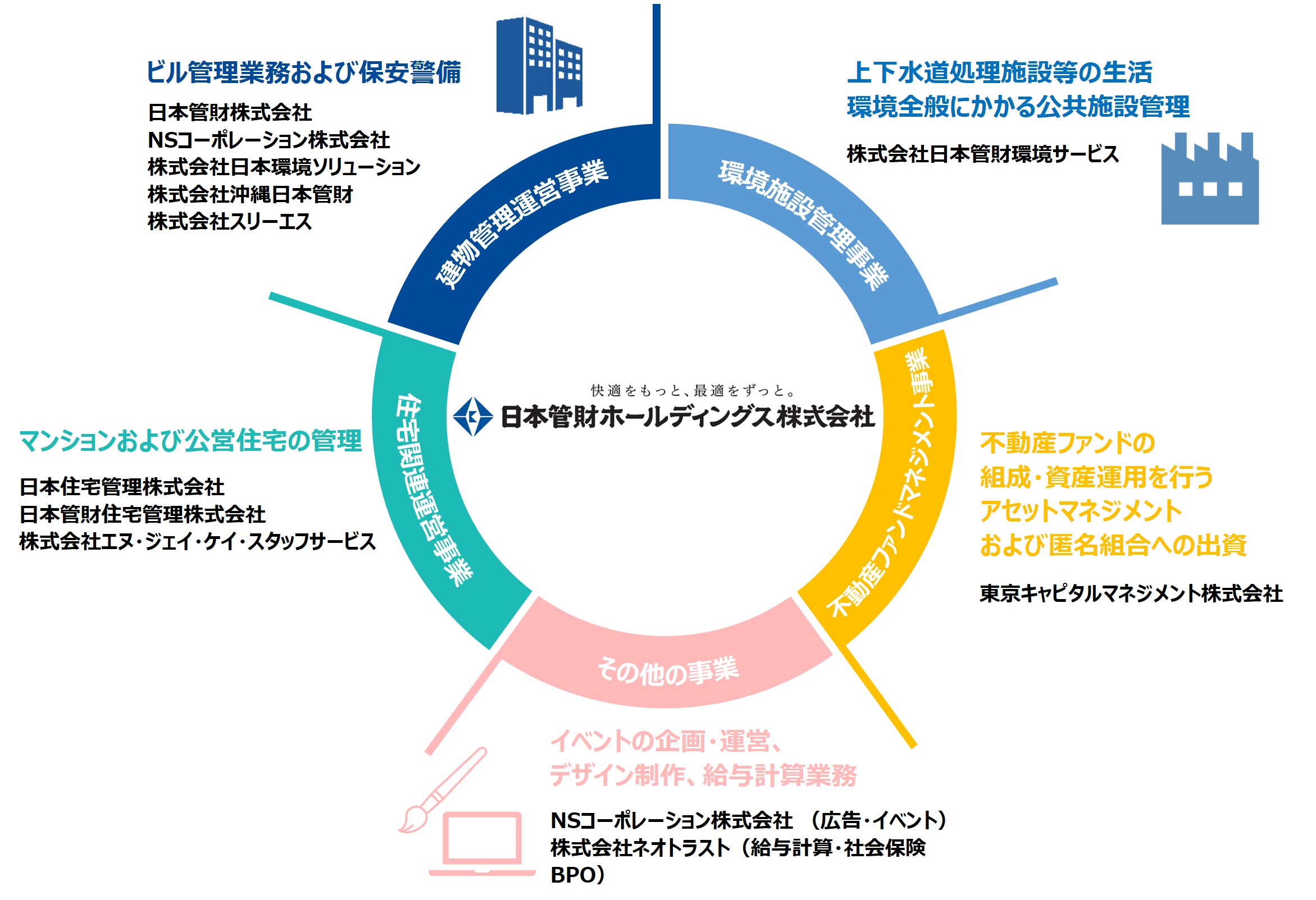 事業内容:オフィスビル、集合住宅、環境施設等の管理運営事業や不動産ファンドマネジメント事業等を営むグループ会社の経営管理及びこれに附帯又は関連する業務