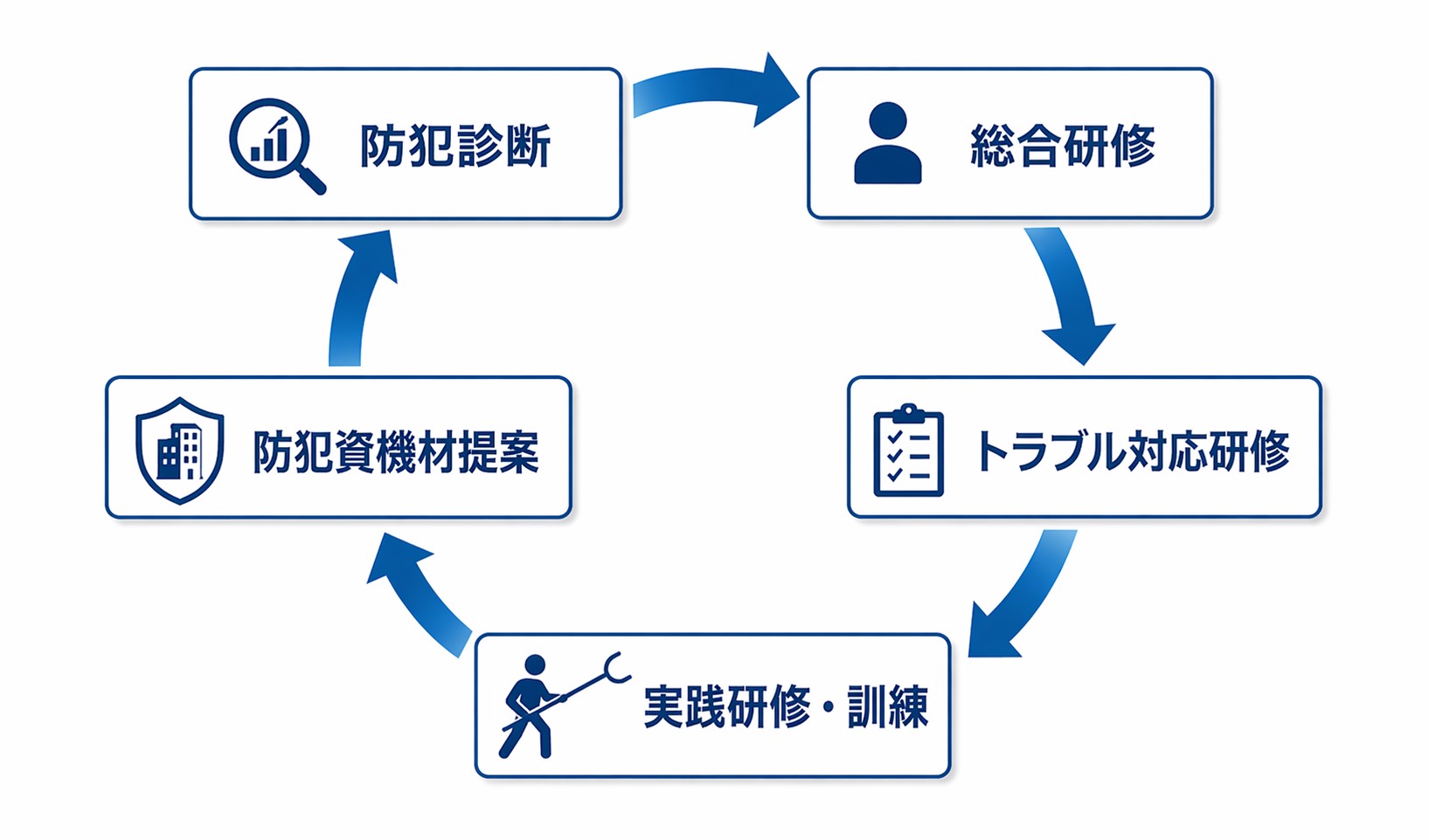 運用定着支援:定期的なフォローアップにより、防犯体制を形骸化させず、状況確認と課題対応を継続します。
