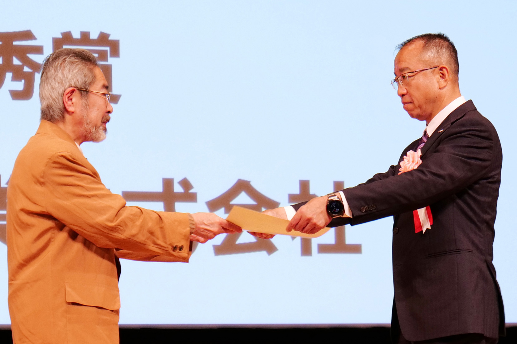 授賞式の様子  右:代表取締役社長 森 安弘(もり やすひろ)  左:一般社団法人 CSV開発機構 理事長    赤池 学(あかいけ まなぶ)様    4月21日(火) 場所:イイノホール
