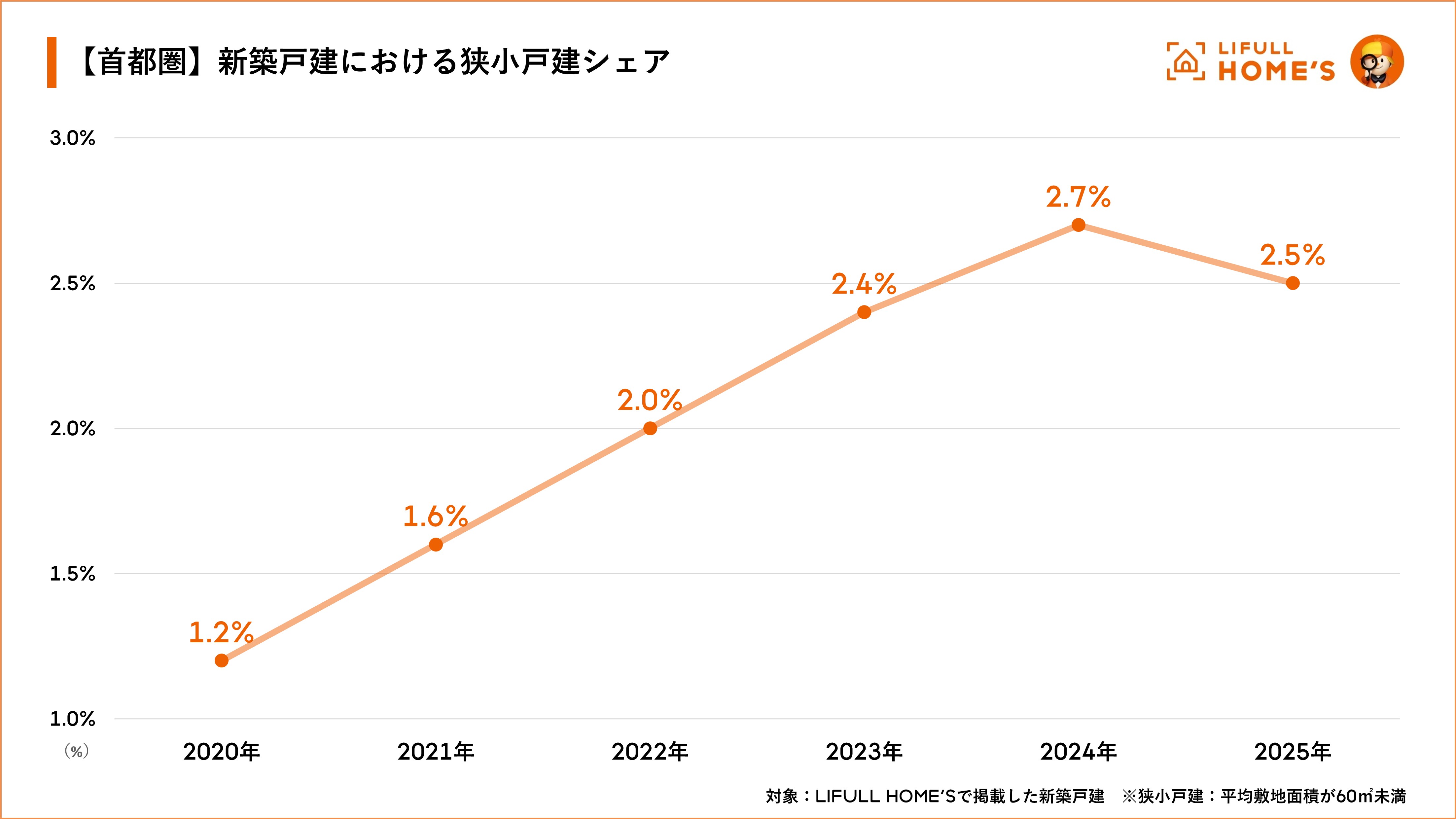 事業を通して社会課題解決に取り組む株式会社LIFULL(本社:東京都千代田区、代表取締役社長:伊東祐司、東証プライム:2120)が運営する不動産・住宅情報サービス「LIFULL HOME’S(ライフルホームズ)」は、首都圏で掲載された新築一戸建てにおける、専有敷地面積が60㎡未満のいわゆる「狭小戸建」について調査しました。