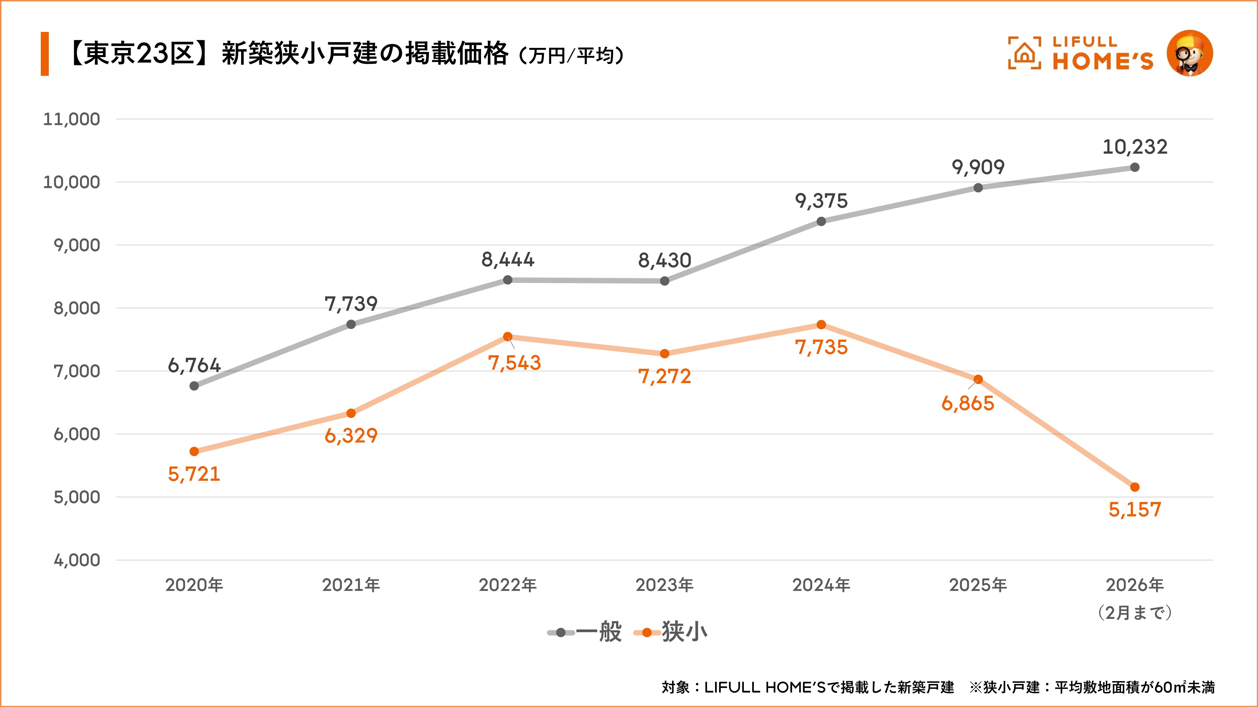 東京23区で敷地面積が100㎡前後の一般的な戸建住宅は年々価格が上昇する傾向にあり、2026年の初動では平均で1億円を突破する状況ですが、同じ新築でも狭小戸建は約半額の5,157万円となっていて、住宅価格が高騰を続ける現在にあって価格優位性が極めて高いと言えます。