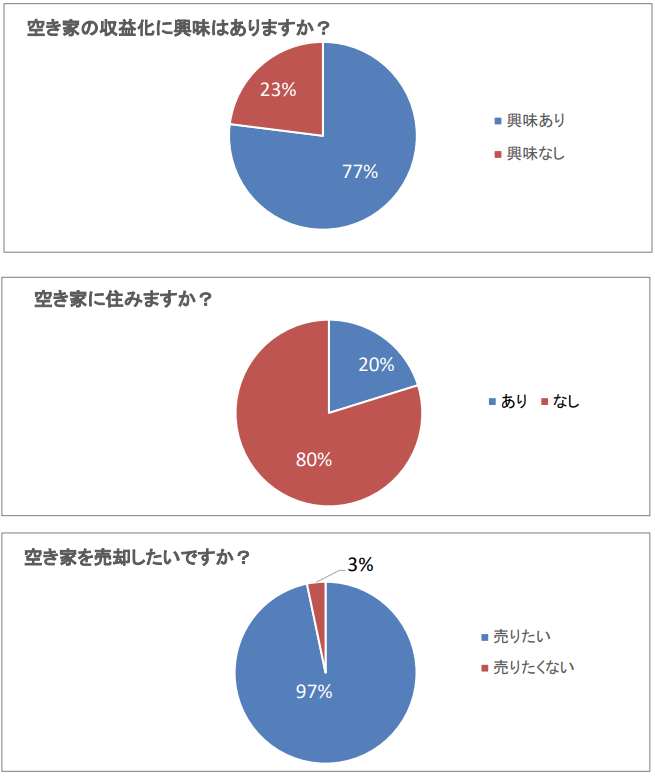結果、空き家の活用(収益化)に興味のある人が77%、空き家に住みたい人が20%、空き家を売却したい人が97%と、圧倒的に売却を希望する人が多いことがわかりました。