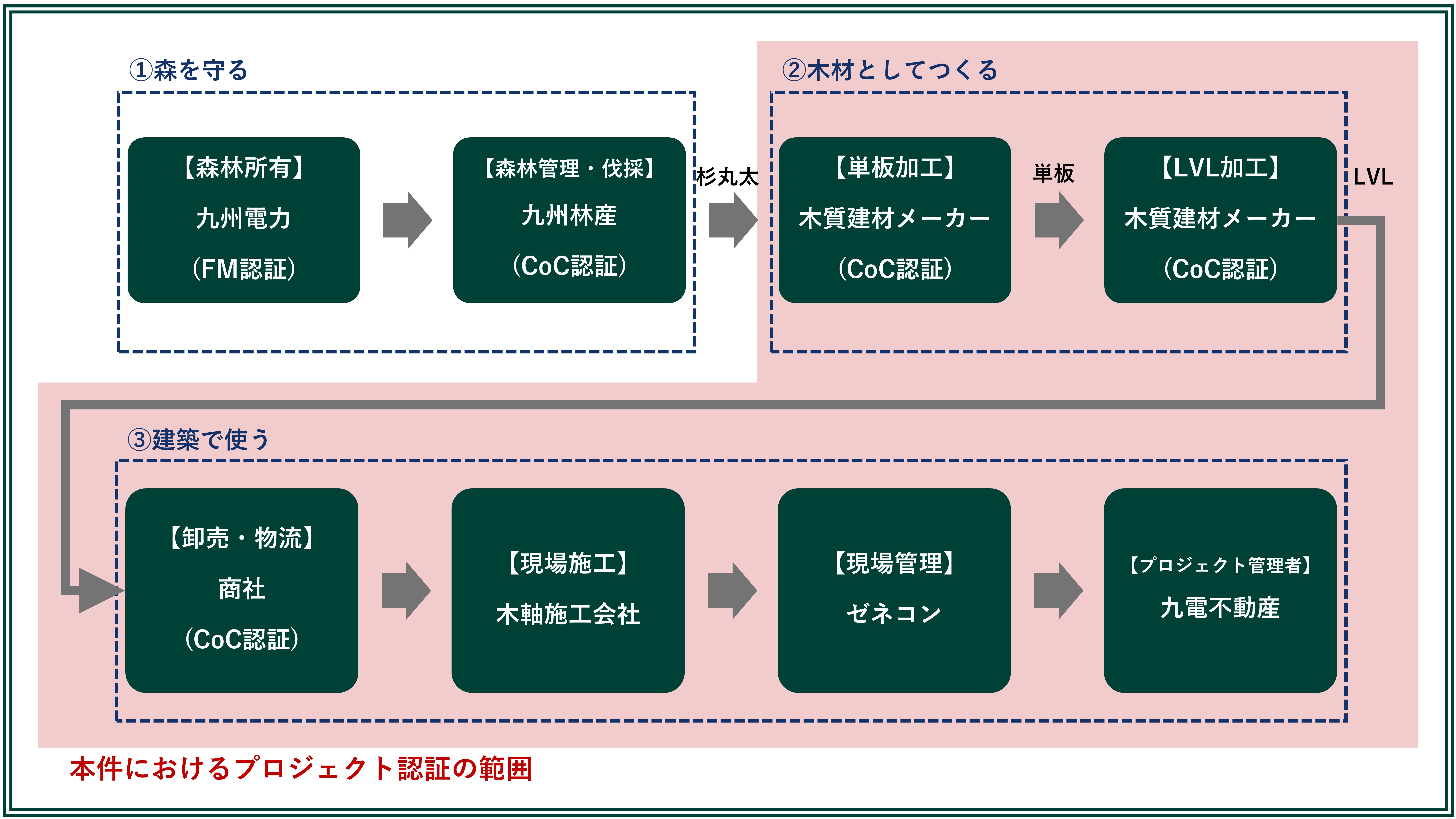 『GROUNDI OHORI』では、九電不動産がこれら一連の流れを建築プロジェクトとして整理し、森林認証制度FSC®における「プロジェクト認証」を取得しました。
