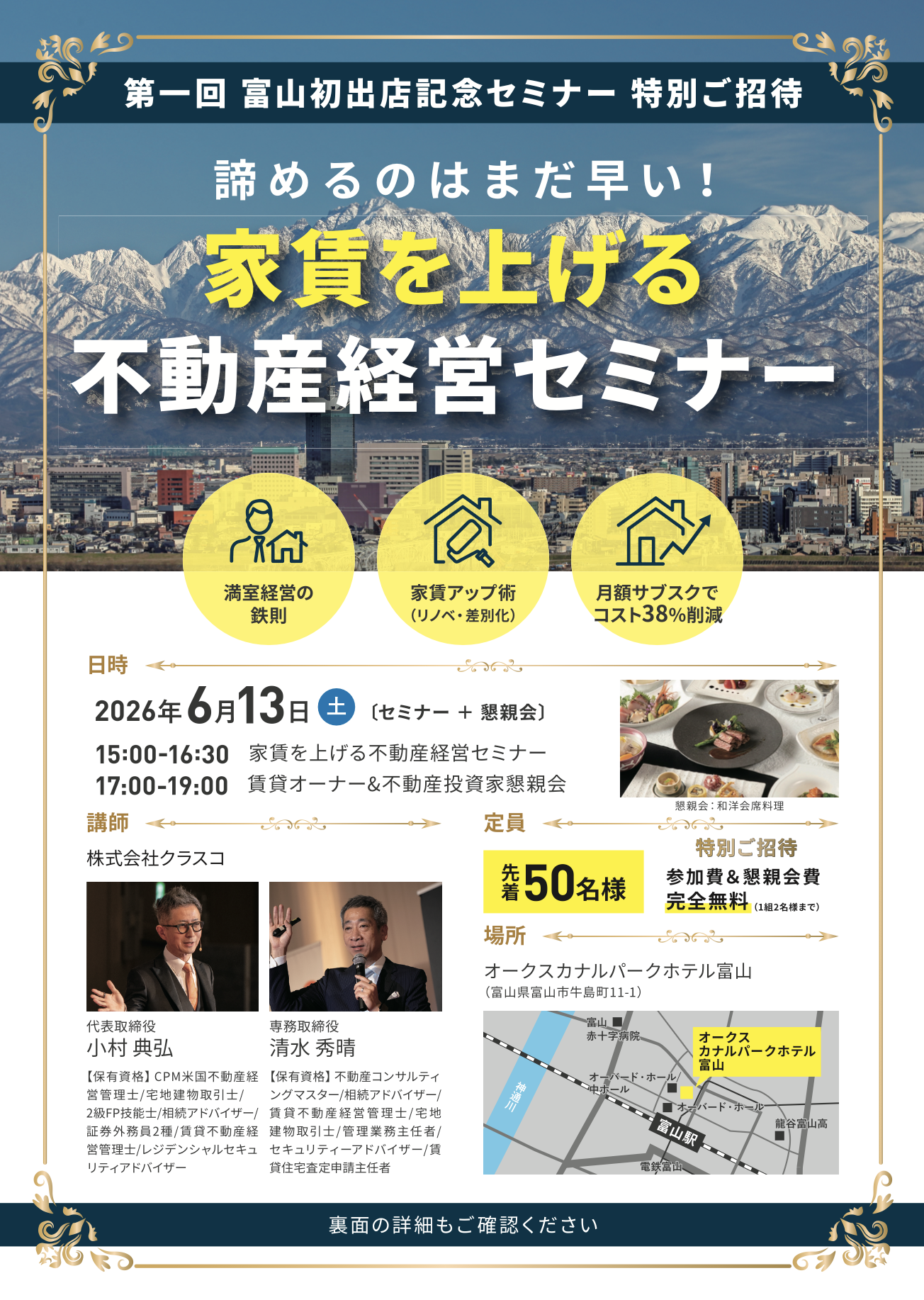 2026年6月13日:第1回 富山出店記念セミナー開催「家賃を上げる満室経営の鉄則」