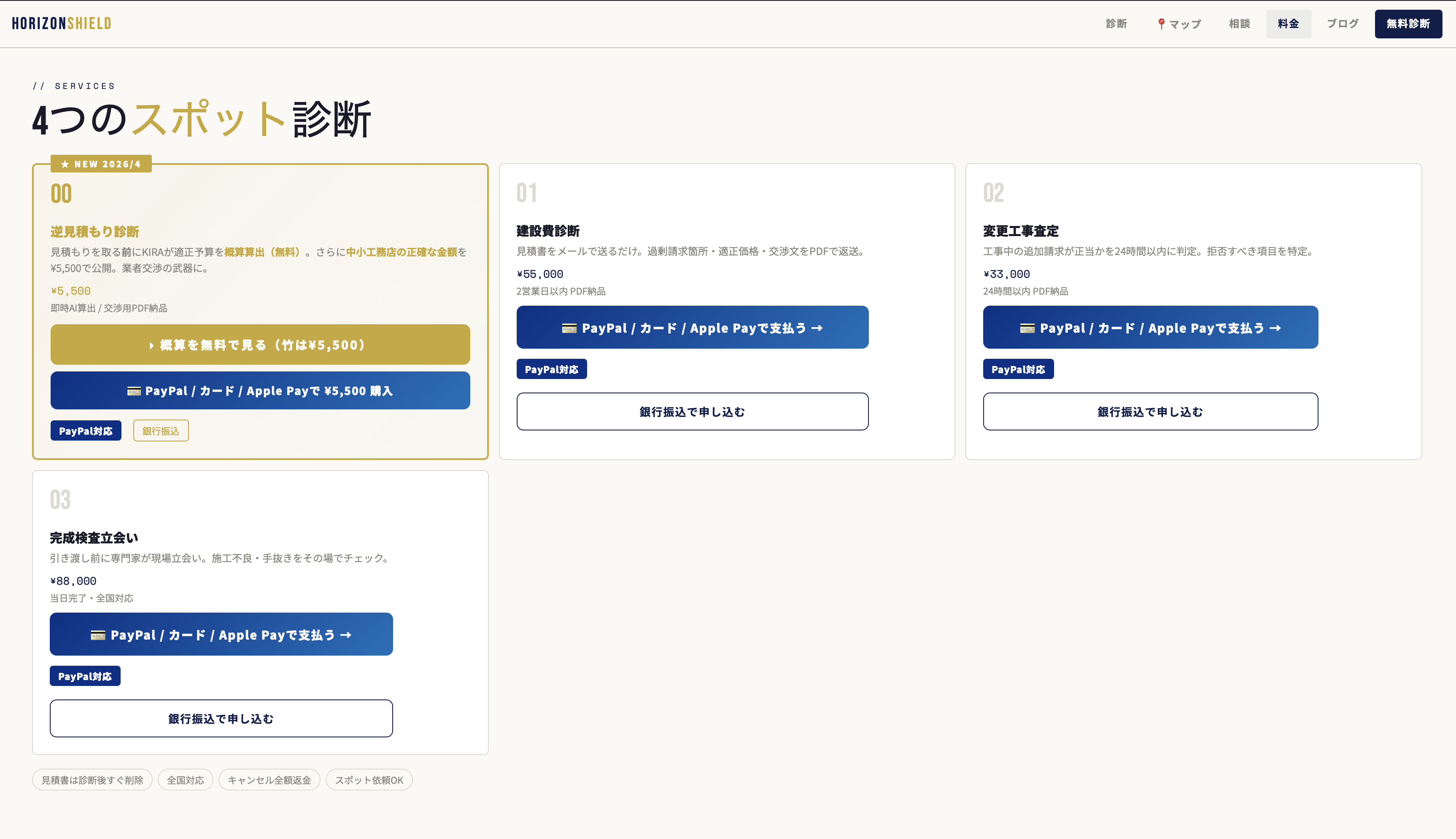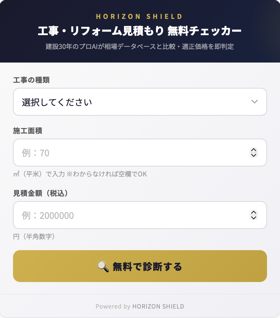 HORIZON SHIELDの「逆見積もり診断PDF」は、この構造を根本から変える。 業者に見積もりを依頼する前に、AIが適正予算を概算算出(無料※一部有料)。さらに¥5,500で中小工務店レベルの正確な金額を公開し、相場比較グラフ・交渉フレーズ5個・出典データ付きの交渉資料として即日納品する。 この資料を手元に持って業者と交渉に臨む施主と、何も知らない施主では、最終的な支払い額に数十万円の差が生まれる。ホルムズ封鎖で資材高騰が続く今こそ、施主が武装すべき局面だ。