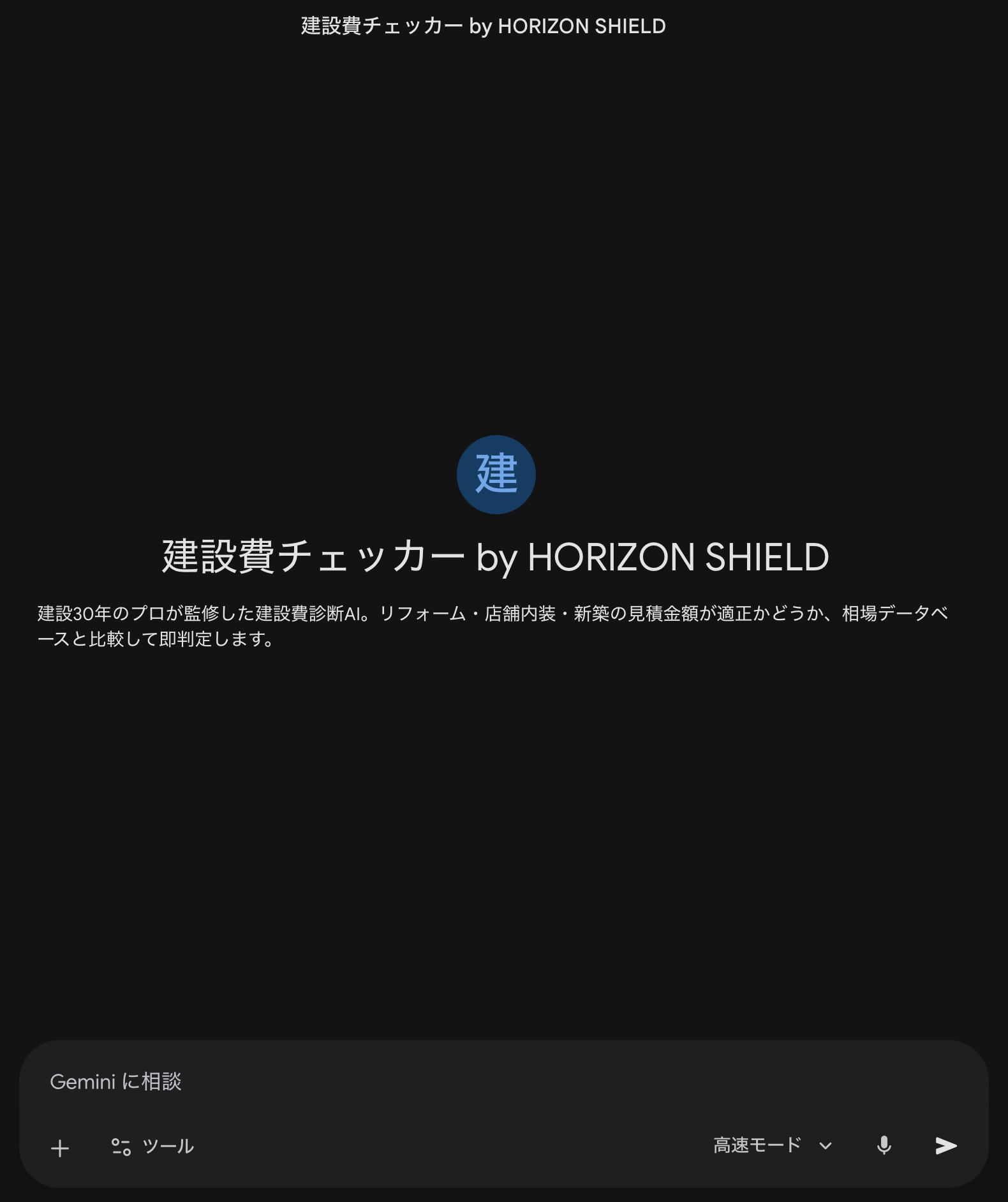 HORIZON SHIELDは建設費チェッカーをChatGPT GPTストア(建設費カテゴリ1位)・Google Gemini Gems・Claude MCPサーバーに同時展開する業界初のAI三刀流体制を実現。ユーザーは使い慣れたAIプラットフォームから無料で建設費診断にアクセスできる。