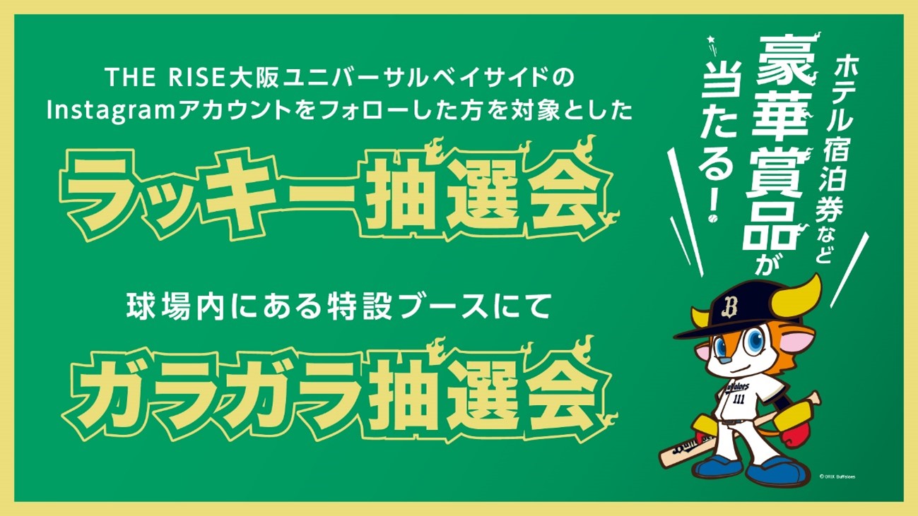 ラッキー抽選会では、THE RISE大阪ユニバーサルベイサイドのInstagramアカウントを通してご応募された方の中から抽選を行い、当選者にオリックス選手サイン入りグッズ・BBQ&温泉付き宿泊券をプレゼントいたします。