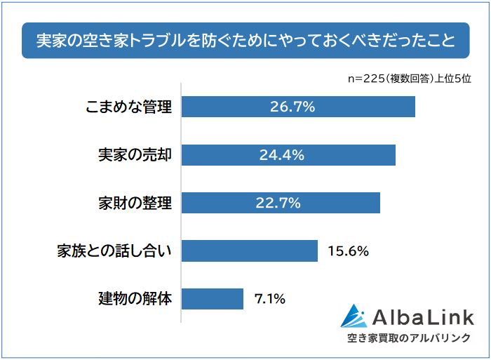 「実家の空き家トラブルを防ぐためにやっておくべきだったこと」の1位は「こまめな管理(26.7%)」、僅差の2位は「実家の売却(24.4%)」、3位は「家財の整理(22.7%)」でした。
