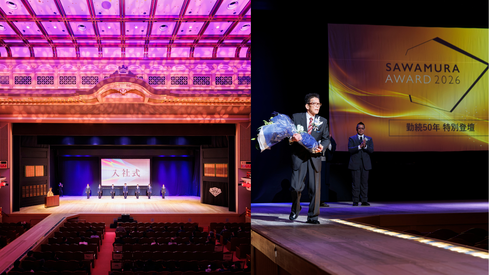 過去5年間で社員数が約2倍(2020年91名から2025年178名)と急成長を遂げ、本年で創業75周年を迎えた総合建設会社である株式会社澤村(本社:滋賀県高島市、代表取締役社長:澤村 幸一郎)は、2026年3月26日(木)に、歌舞伎発祥の地「京都四條 南座」 にて、全社総会・入社式・社内表彰式の3部構成となる「SAWAMURA AWARD 2026」を開催いたしました。当社による南座での社内式典開催は、本年で3年連続となります。