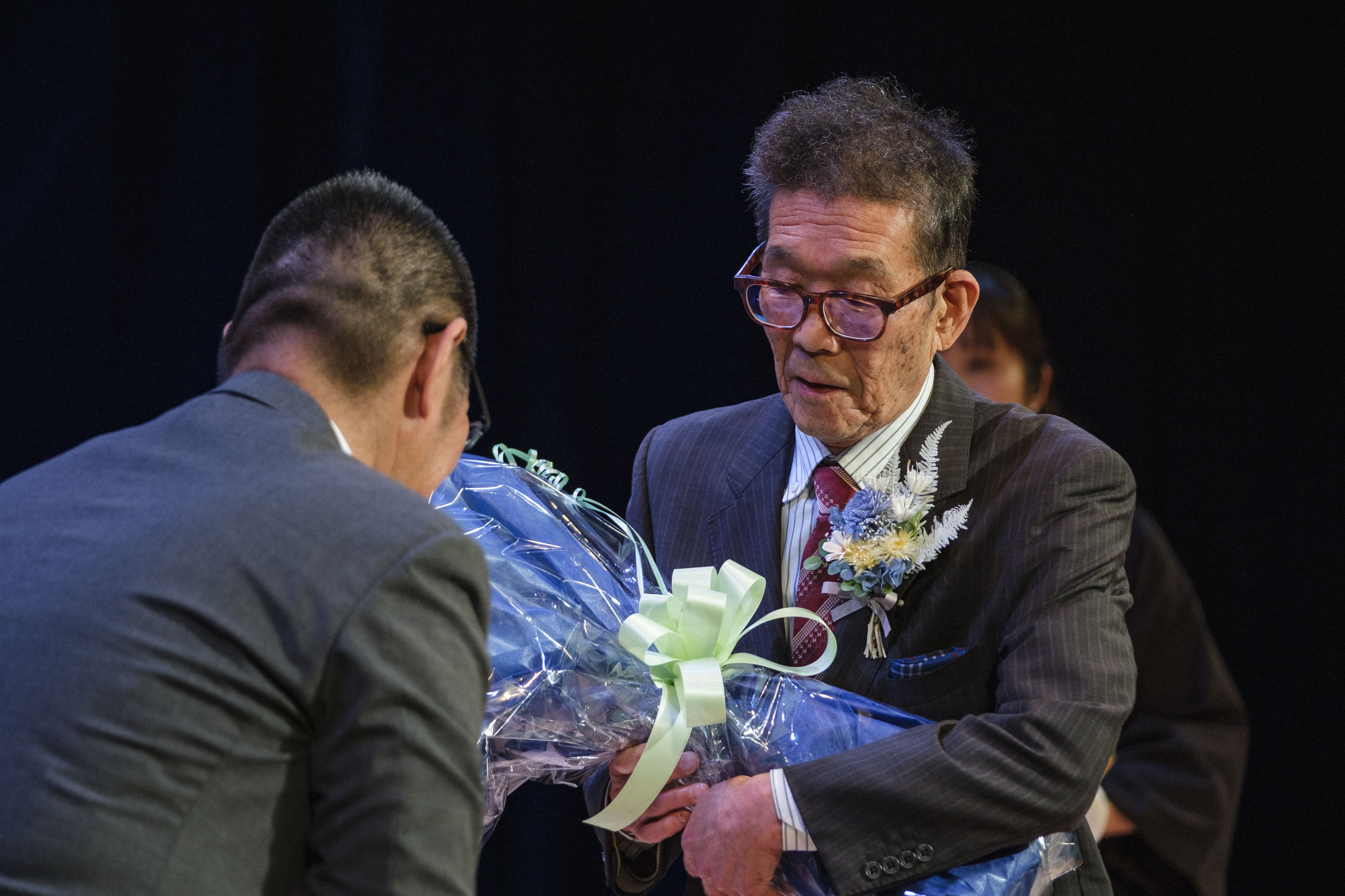 式典の幕開けは、会社の原点である創業者の想いや歴史をたどるムービーの上映。その後、当社初となる勤続50年の特別表彰が執り行われました。南座の舞台で花束を受け取り、これまでの歩みと「わたしの原点」を語るベテラン社員の姿に、会場全体が温かな感動と万雷の拍手に包まれました。