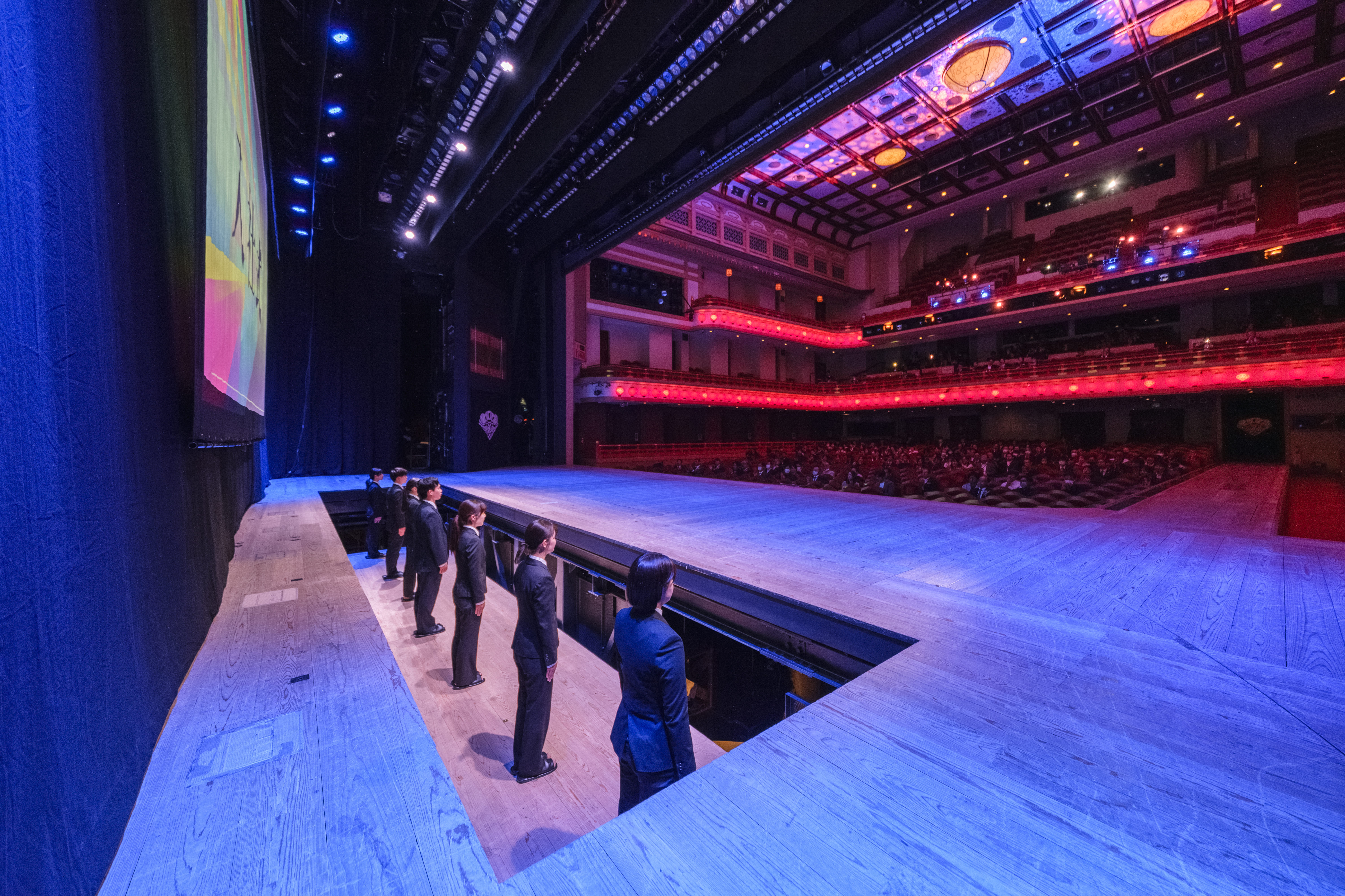 その感動の余韻の中、第1部後半では2026年度新入社員7名の入社式が執り行われました。歌舞伎座ならではの舞台機構である「せり」から登場した新入社員たちは、一人ずつセンターマイクの前に立ち、自らの「原点となる言葉」と未来への意気込みを力強く発表しました。 長きにわたり技術と精神を守り抜いたベテラン社員から、次なる成長の原動力となる新入社員へとバトンが受け継がれる象徴的な時間となりました。