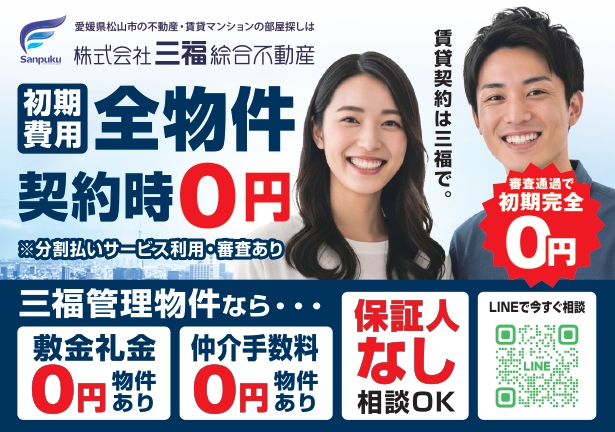 三福綜合不動産は、松山市・伊予市・東温市・砥部町など、愛媛県中予エリアで50年以上にわたり賃貸仲介・管理を行う不動産会社です。