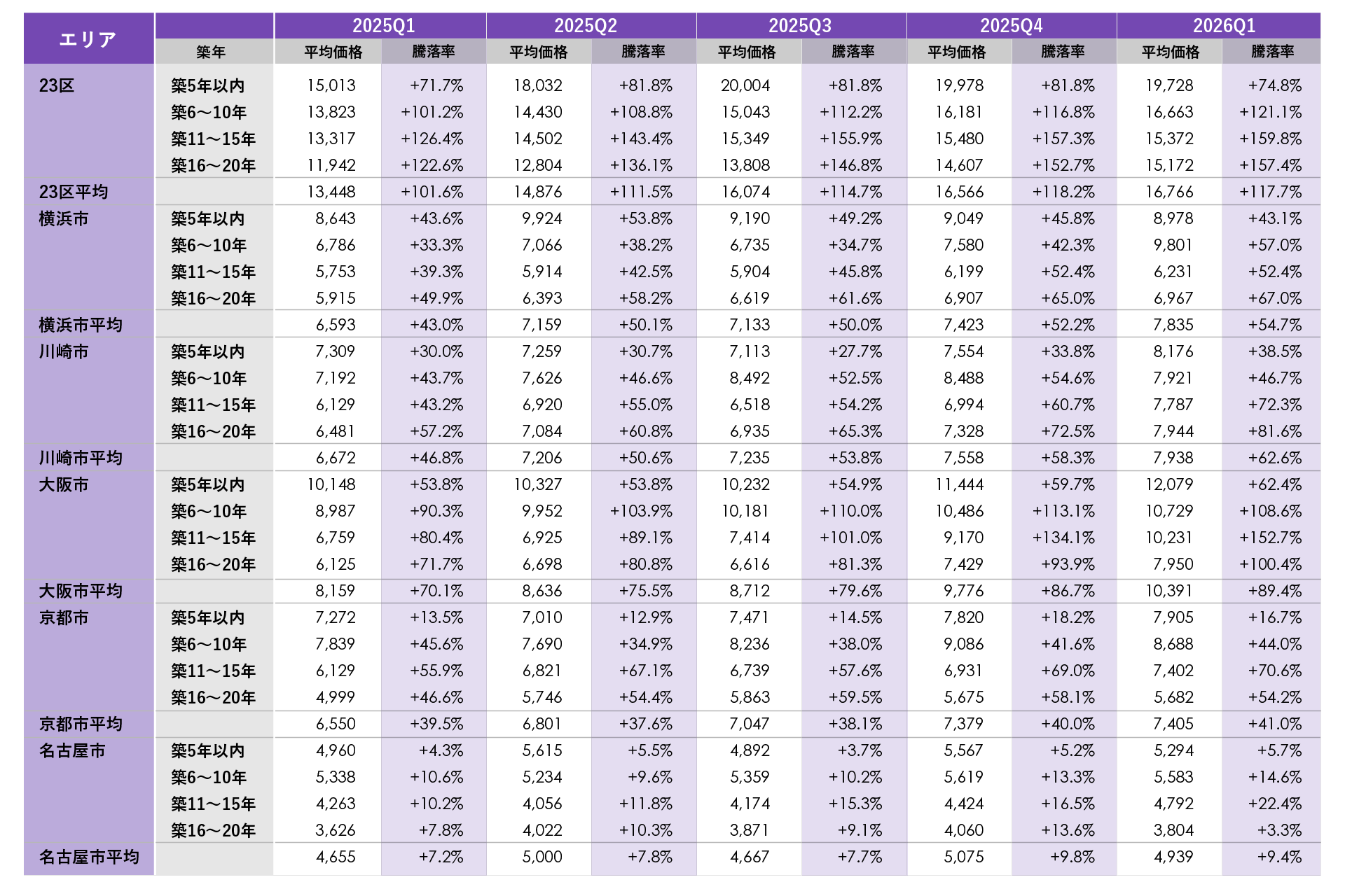 不動産ビッグデータとAI等のテクノロジーを活用し、不動産マーケティングプラットフォームを提供する株式会社マーキュリー(本社:東京都港区 代表取締役:陣 隆浩、証券コード5025、以下「当社」)は、独自視点で不動産マーケットの動向を発信しております。今回は2026年第1四半期(1月~3月)の主要エリアの中古マンション価格動向をまとめました。