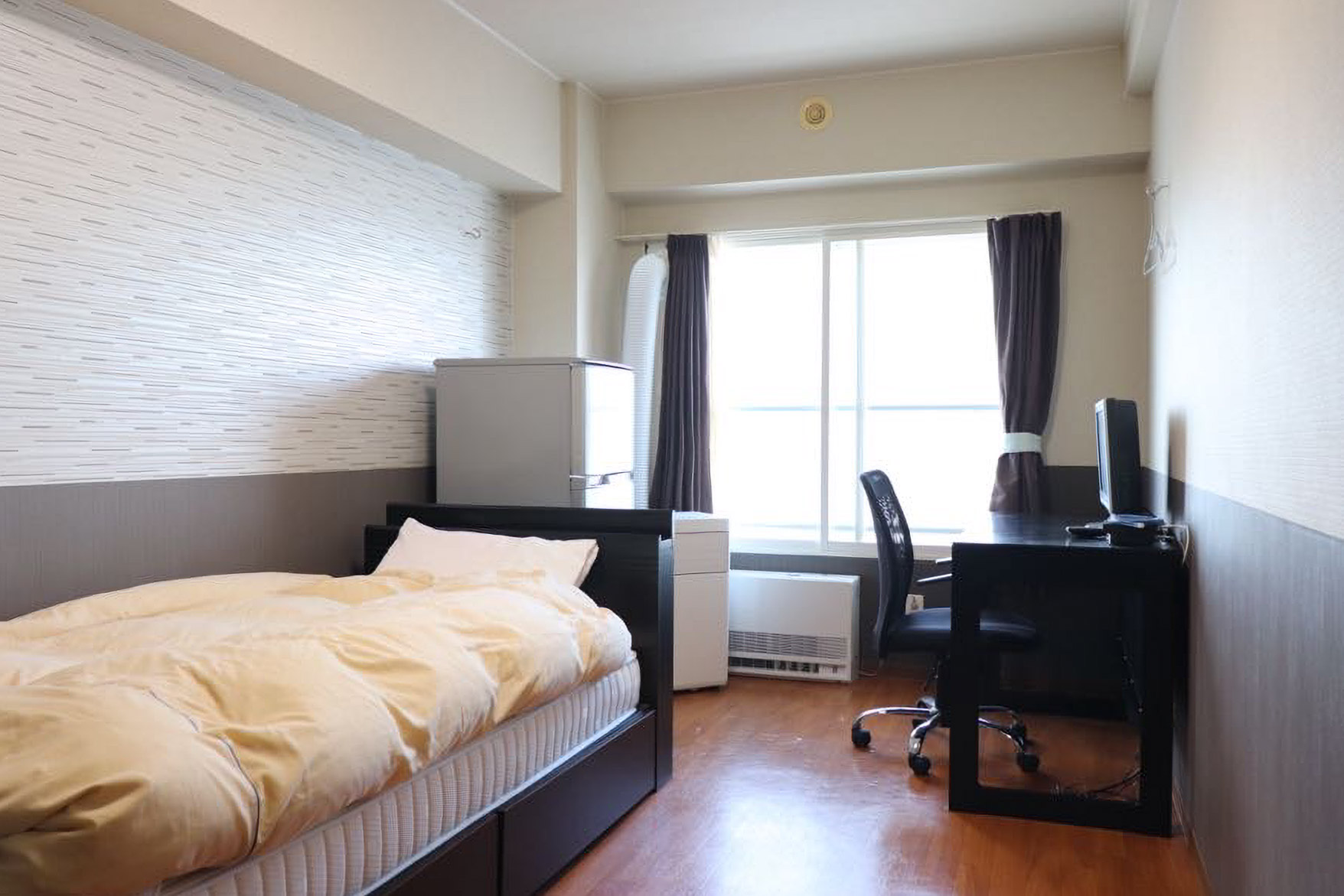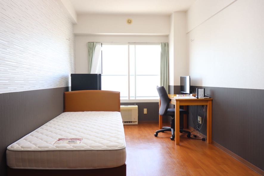 個室設備:冷蔵庫、テレビ、デスク、チェア、暖房機器、スポットクーラー、照明、ベッド(マット付き)、カーテン、クローゼット等