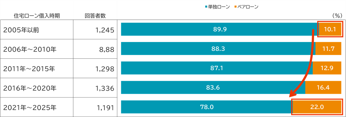 2021年~2025年の借入れではペアローンの利用割合は22.0%となり、20年前と比べて約2倍になりました(図表1)。現在も単独ローンが多数派ではあるものの、ペアローンによる住宅取得も一定の割合で定着してきている状況が見て取れます。