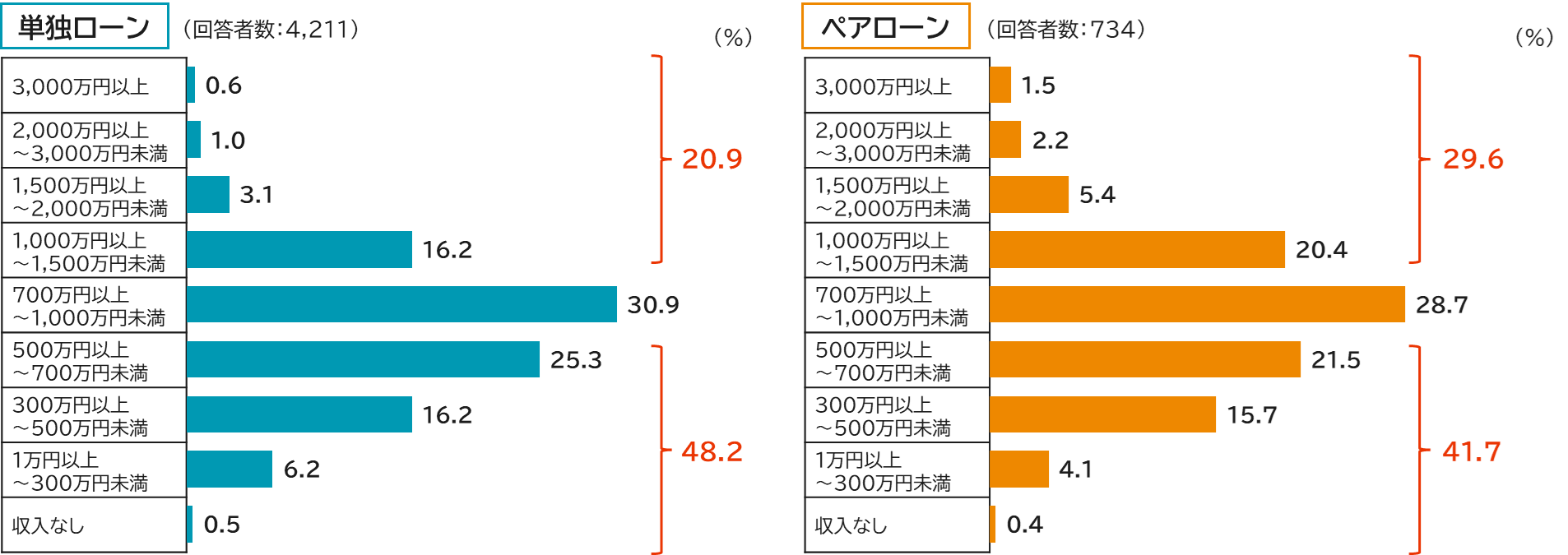 ただし、700万円未満の割合は単独ローン世帯48.2%、ペアローン世帯41.7%である一方、1,000万円以上の割合は単独ローン世帯20.9%、ペアローン世帯29.6%となっており、ペアローン世帯では高収入層の比重がやや高い結果となっています。