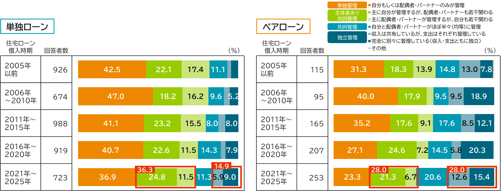 続いて、家計管理の形態を確認しました。設問の選択肢を「単独管理」「主体者あり共同管理」「共同管理」「独立管理」の4つのスタイルに大きく分けてみると、いずれのローン形態でも「単独管理」が減少しているものの、単独ローン世帯(2021年~2025年)は、依然として「単独管理」(36.9%)が最も多く、次いで「主体者あり共同管理」(36.3%)となっています(図表4)。