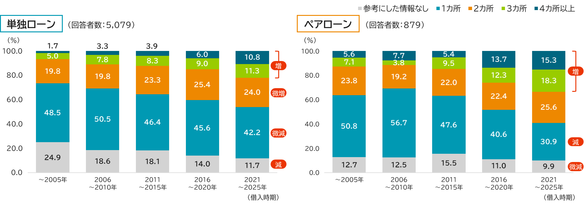 ペアローン世帯においては、「1カ所のみ」を参考にした割合が減少し、「3カ所以上」の割合が高まっています。