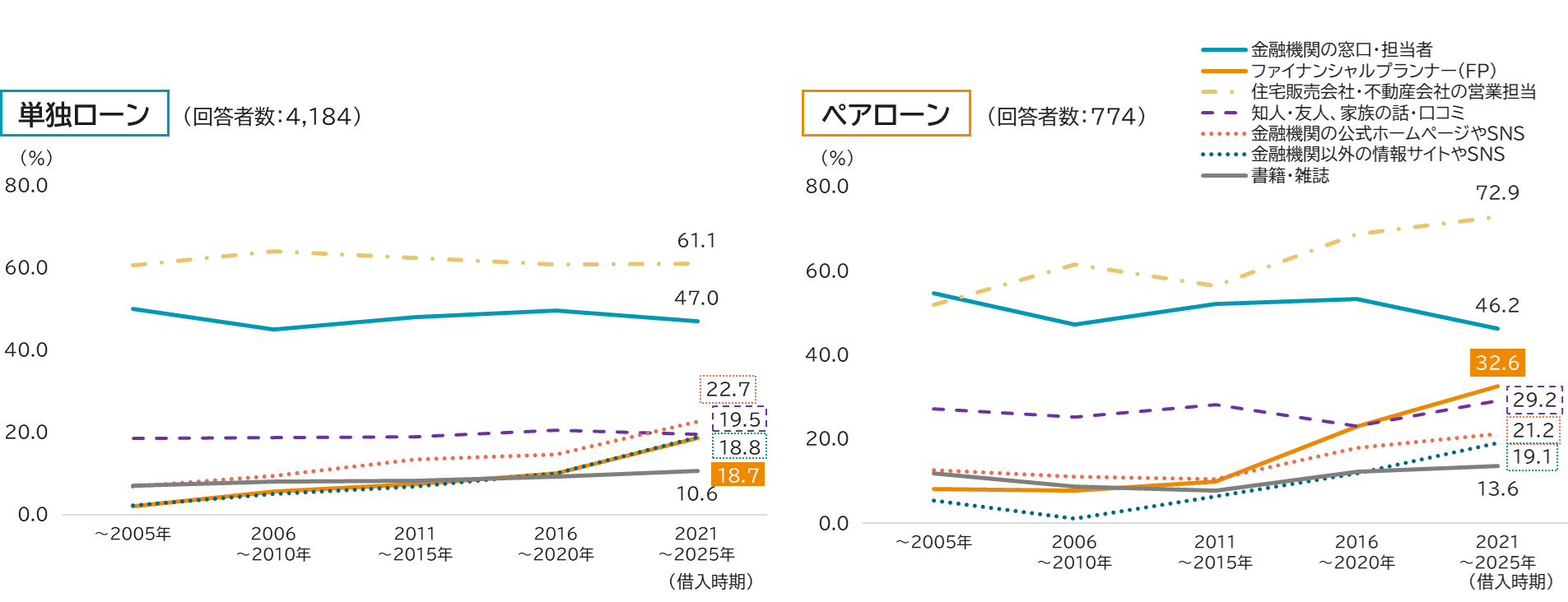 いずれにおいても、情報収集の複線化が進んでいますが、その変化の程度はペアローン世帯の方が大きくなっています。ペアローンは契約に関わる主体が複数となることもあり、単独ローンに比べて、より多角的に情報を収集しながら検討が進められているものと思われます。