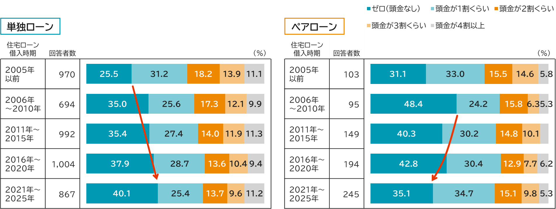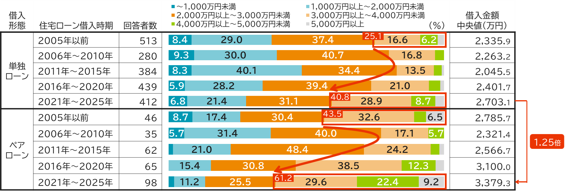 「世帯年収の1~3割」が大半を占めるものの、2021年~2025年には「4割以上」が増加し、単独ローン世帯、ペアローン世帯の双方とも10%を超えている