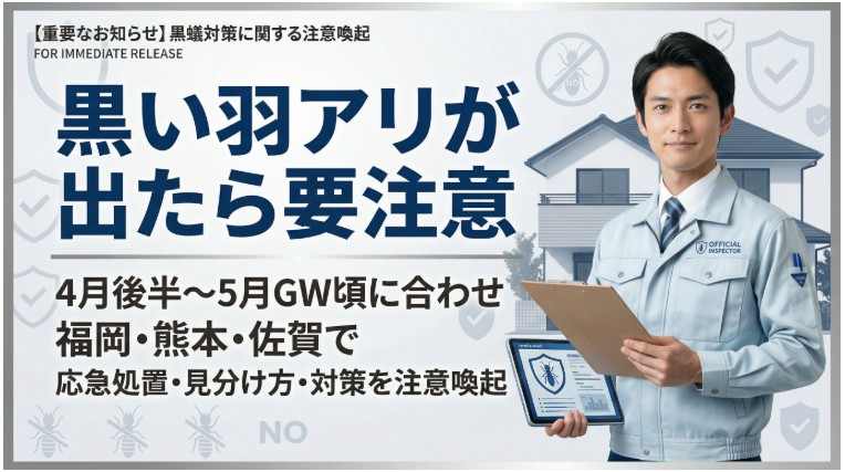 株式会社プログラント(本社:熊本県熊本市、代表取締役:藤井 靖光)は、ヤマトシロアリの羽アリが発生しやすい4月後半〜5月のゴールデンウィーク時期に合わせ、福岡県・熊本県・佐賀県を対象に、家の中に黒い羽アリが出た際の応急処置、シロアリ対策、見分け方について注意喚起を行います。
