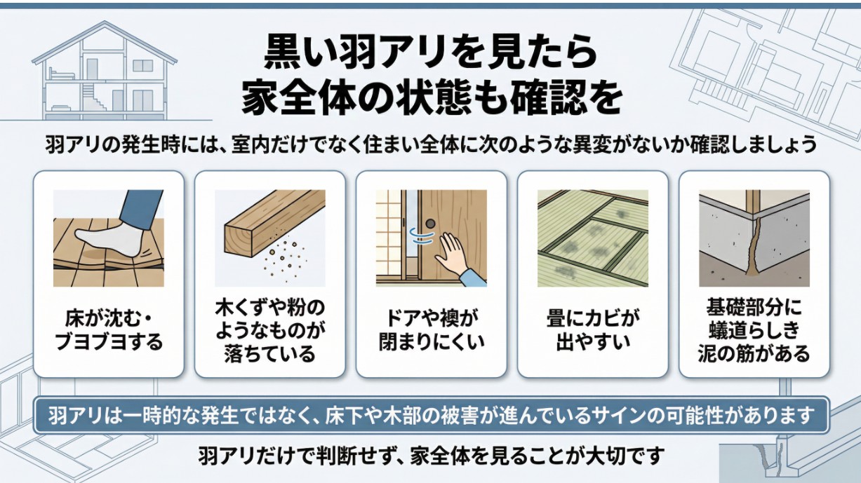 ・家の中に黒い羽アリが出た場合、床下や木部でシロアリが活動している可能性がある