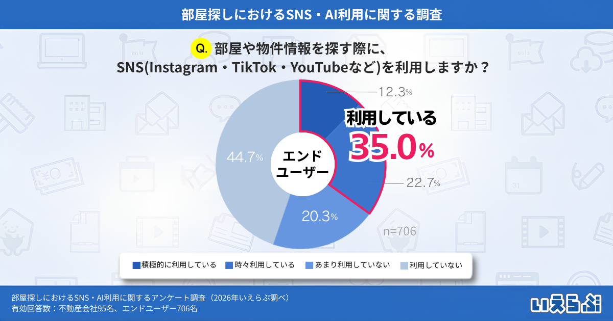不動産業界特化のDX支援サービスを展開する、株式会社いえらぶGROUP(本社:東京都新宿区、代表取締役:岩名泰介、以下「いえらぶGROUP」)は、不動産会社・エンドユーザーに対して「部屋探しにおけるSNS・AI利用に関するアンケート調査」を実施しました。有効回答801件の調査結果を発表します。