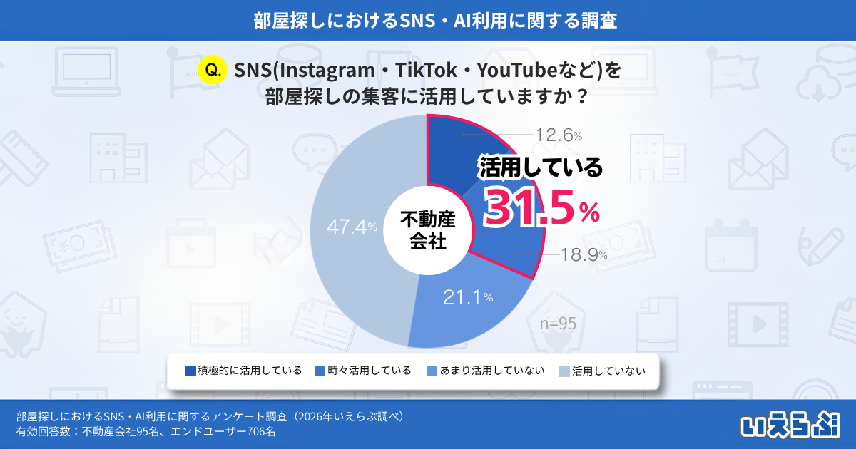 次に、不動産会社に「SNSを部屋探しの集客に活用していますか?」という質問をしたところ、「積極的に活用している」(12.6%)、「時々活用している」(18.9%)、「あまり活用していない」(21.1%)、「活用していない」(47.4%)という結果となりました。SNSを活用していると回答した不動産会社は、約3割にとどまることがわかります。