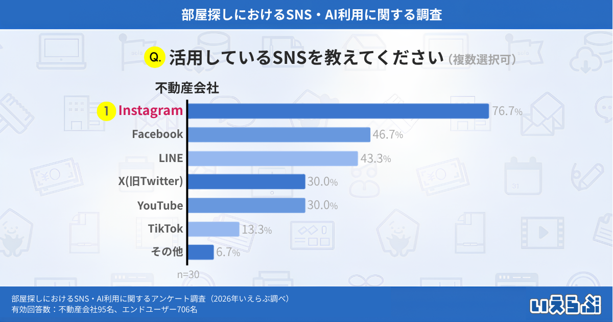 ※2 不動産会社が運用しているSNS第1位はInstagram!一方エンドユーザーが住まい探しに利用したいSNSはYouTubeが最多に|SNSの利用についてのアンケート調査 いえらぶGROUP