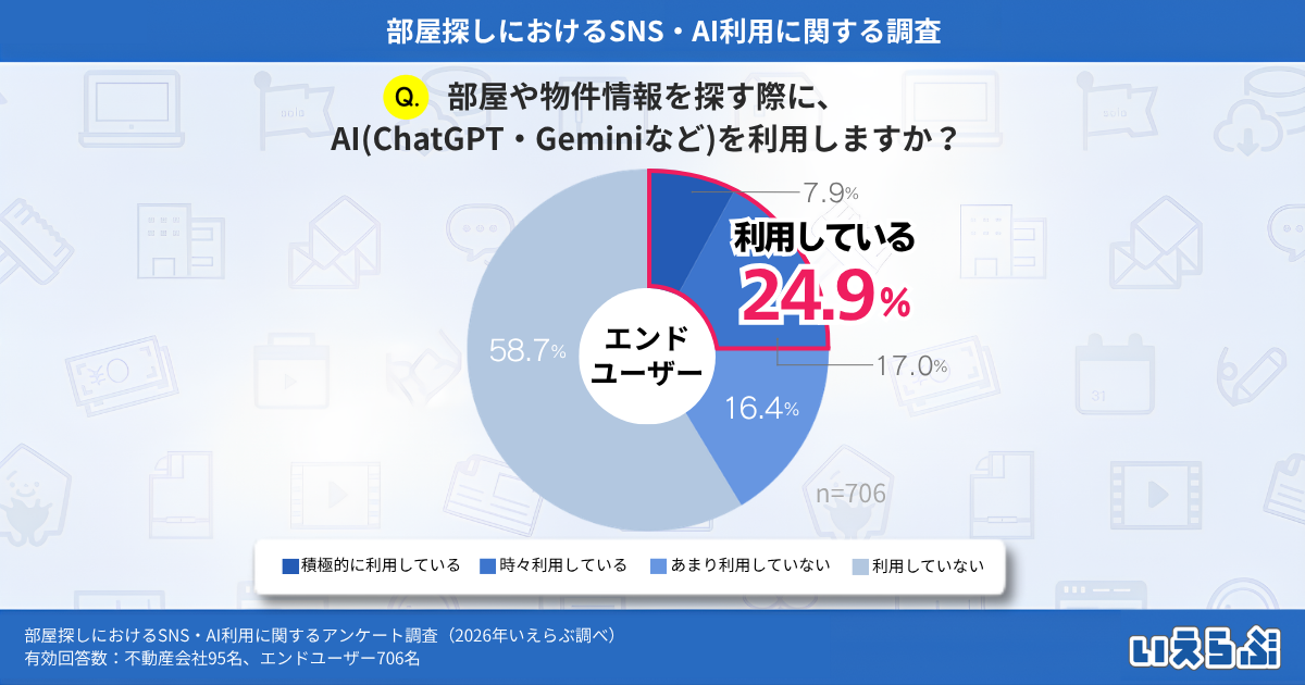 エンドユーザーに「部屋や物件情報を探す際に、AI(ChatGPT・Geminiなど)を利用しますか?」という質問をしたところ、「積極的に利用している」(7.9%)、「時々利用している」(17.0%)、「あまり利用していない」(16.4%)、「利用していない」(58.7%)という結果となりました。