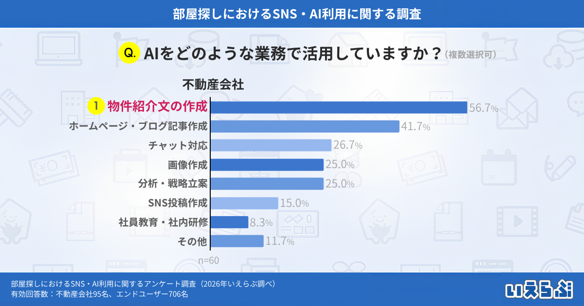 業務において、AIを「積極的に活用している」「時々活用している」不動産会社(※6)に「AIをどのような業務で活用していますか?」という質問をしたところ、「物件紹介文の作成」が56.7%で最も多く、次いで「ホームページ・ブログ記事作成」が41.7%となりました。