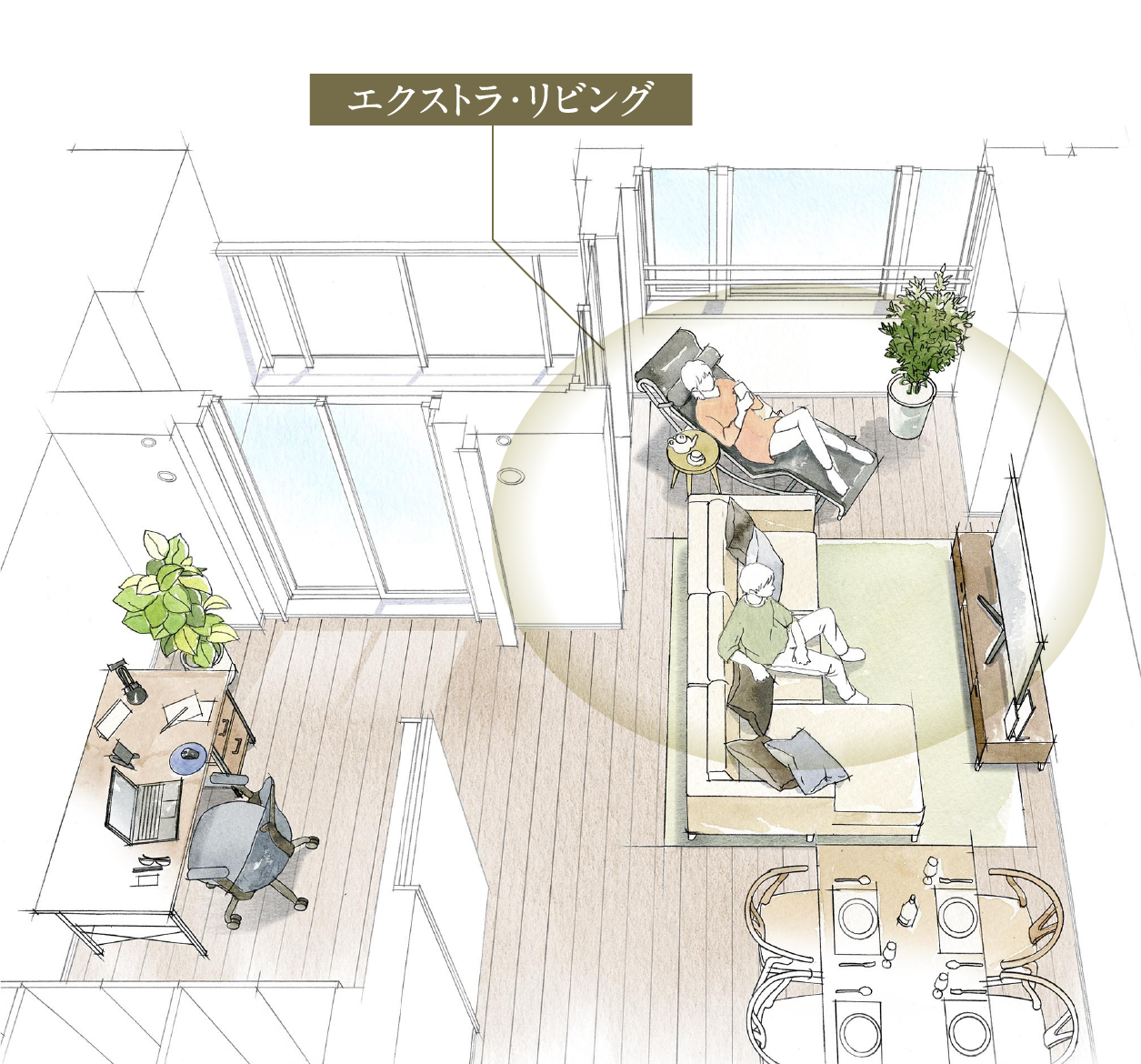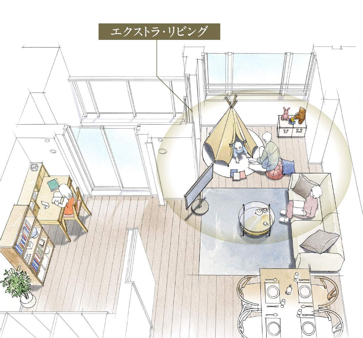 ※掲載の完成予想イラストは設計図書を基に描き起こしたもので、実際とは多少異なる場合がございます。設備機器等は一部省略または簡略化しております。各部材等につきましては、実際と質感・色等の見え方が異なる可能性があります。また、今後変更になる場合があります。家具・調度品等は販売価格に含まれておりません。