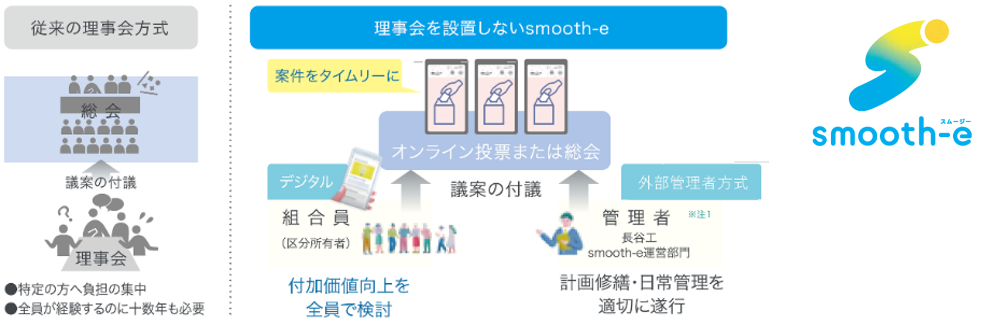 理事会を設置しない「外部管理者方式」を採用し、デジタル技術を活用したマンション管理サービス「smooth-e(スムージー)」を導入します。従来の理事会方式では居住者の中から理事を選出し管理運営に携わりますが、「smooth-e」では株式会社長谷工コミュニティ(本社:東京都港区、代表取締役社長:髙木 丈彦)が管理者となり、居住者に代わって日常管理など専門的な業務を行います。居住者はパソコンやスマートフォンを使って気軽にマンション管理に関わることができます。