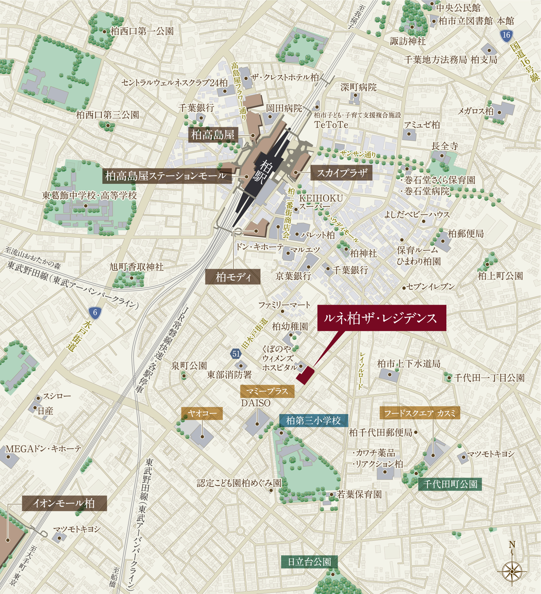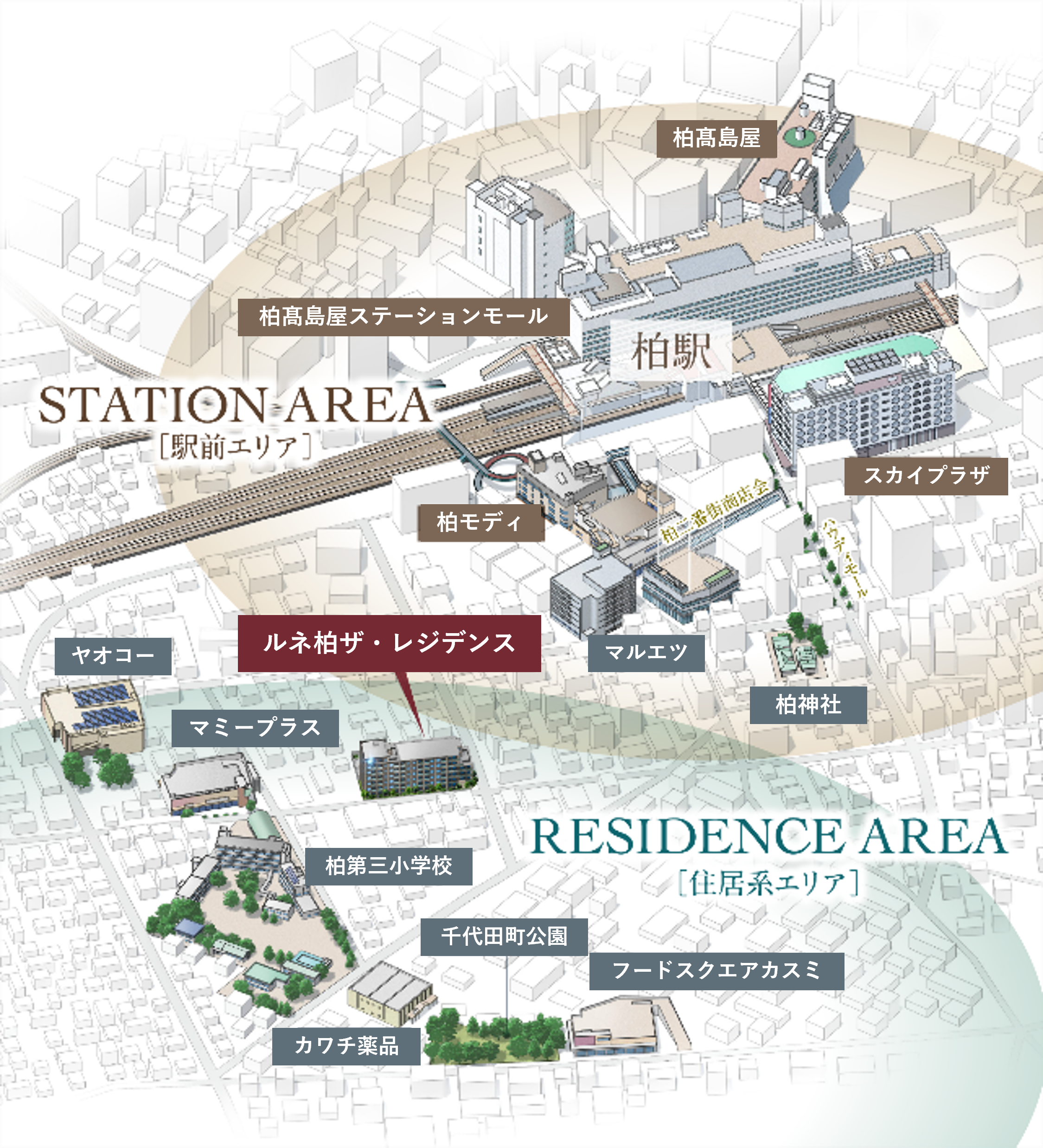 本物件は再開発構想が進行するJR「柏」駅から徒歩10分の立地に誕生します。本物件からは「柏モディ」・「ハウディモール」・「柏二番街商店会」まで徒歩8分、「柏高島屋ステーションモール」まで徒歩11分と大型商業施設が徒歩圏内に揃う一方、現地は住居系用途地域が広がる落ち着いた住環境が形成されています。