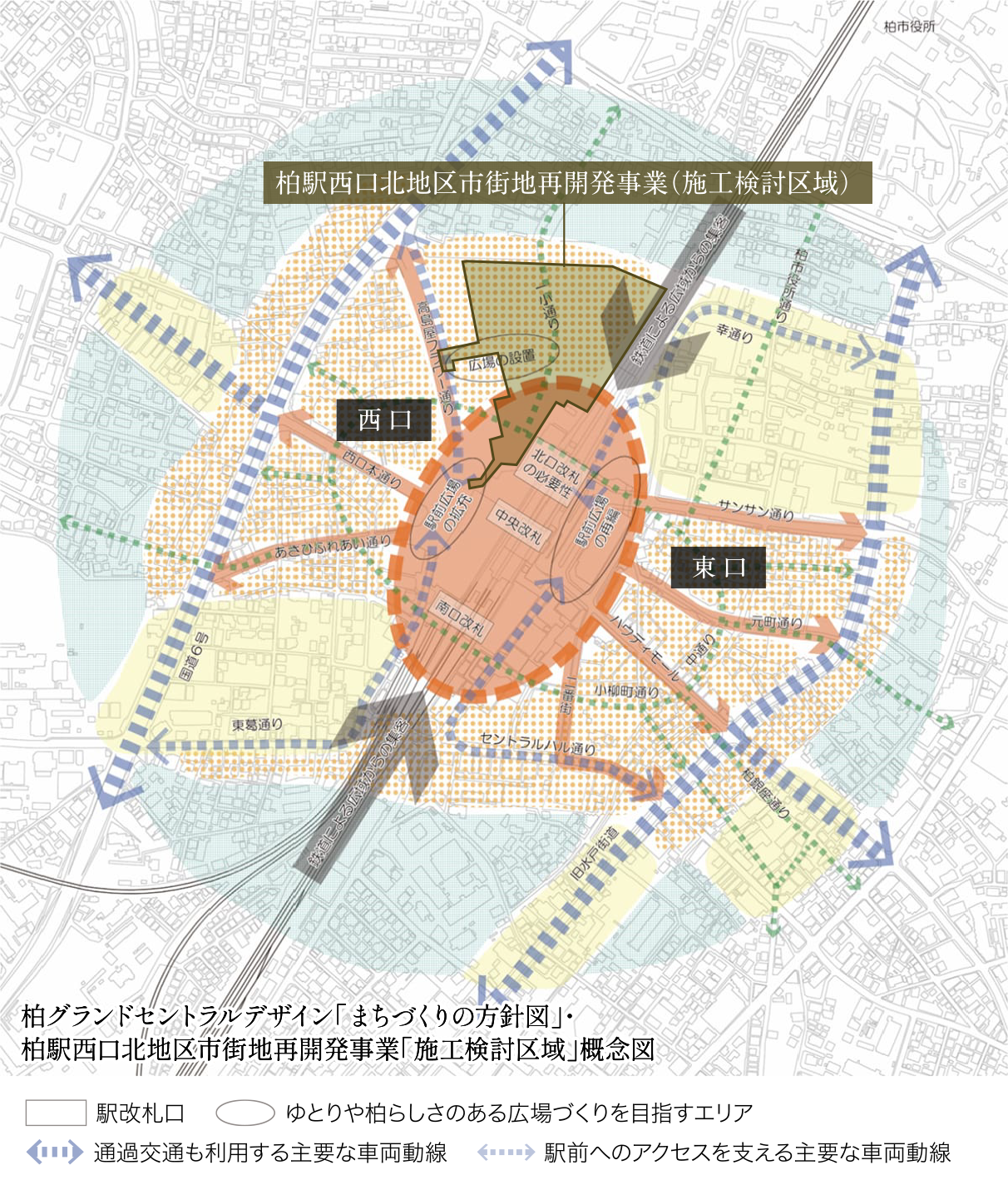 ※掲載の再開発概念図は、「柏アーバンデザインセンター(UDC2)」と「柏駅西口北地区市街地再開発準備組合」の各ホームページを参照して、一部デザイン処理したもので実際とは異なります。