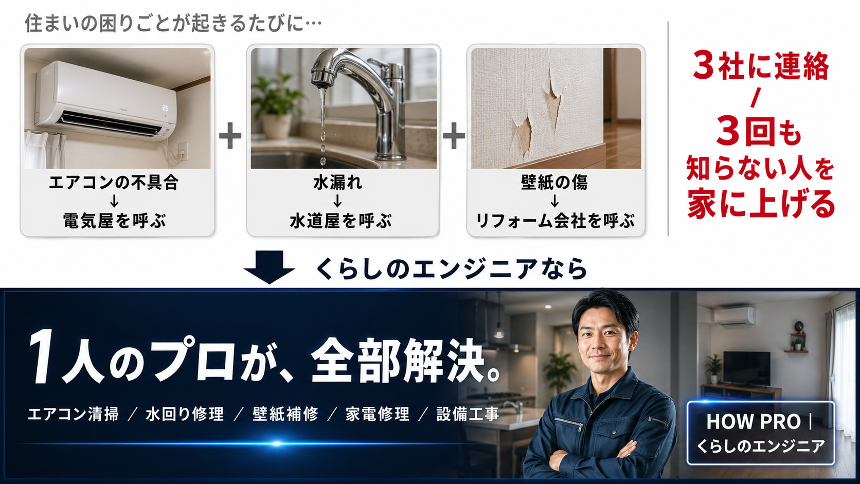 エアコンの不具合は電気屋、水漏れは水道屋、壁紙の傷はリフォーム会社——住宅の困りごとが起きるたびに、別々の業者を探し、知らない人を自宅に上げなければならない。