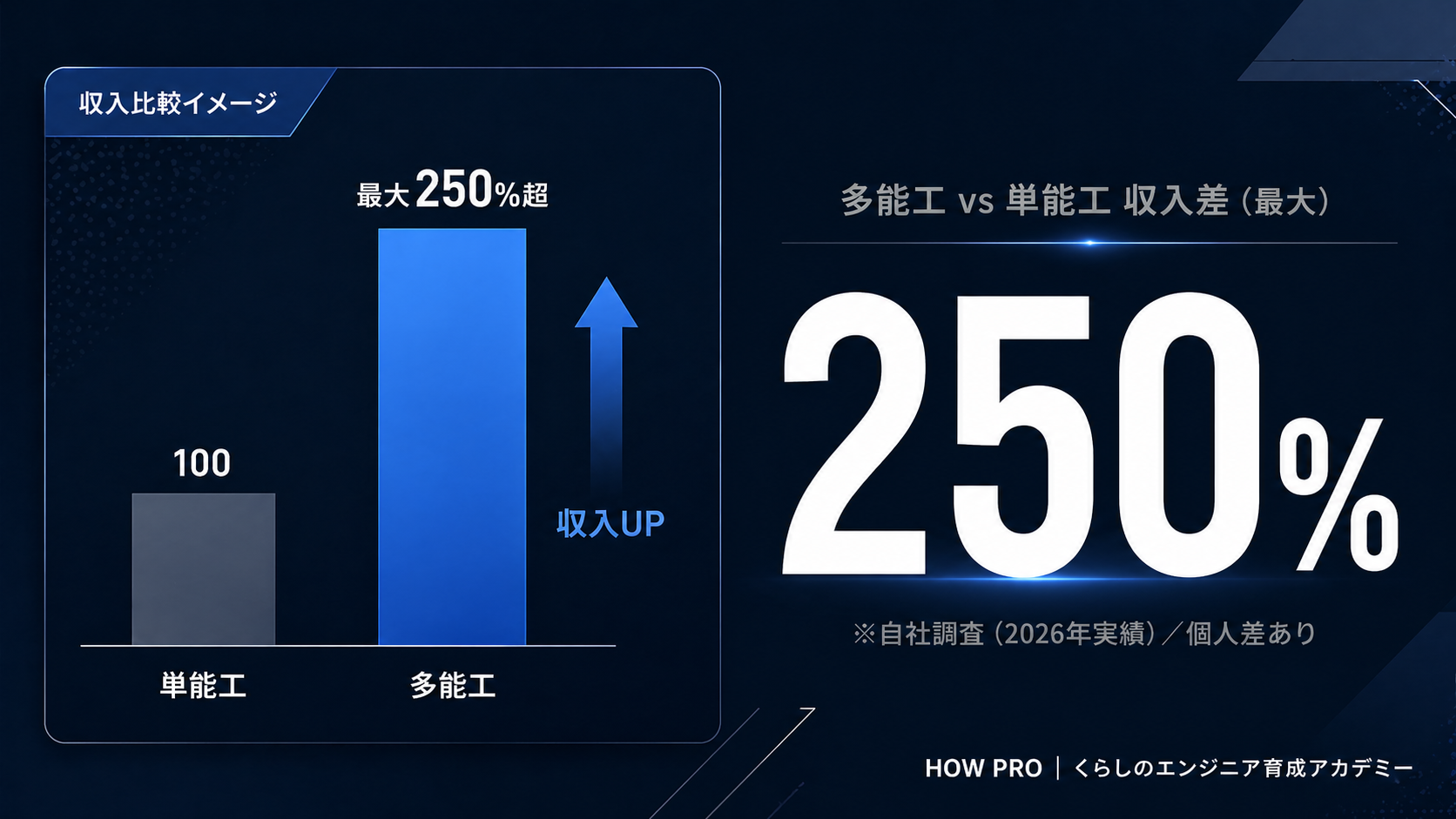 HOW PROの実績データが示す数字は明確だ。多能工化を実現したエンジニアと、単能工にとどまるエンジニアとでは、収入に最大250%超の差が生まれている。※1