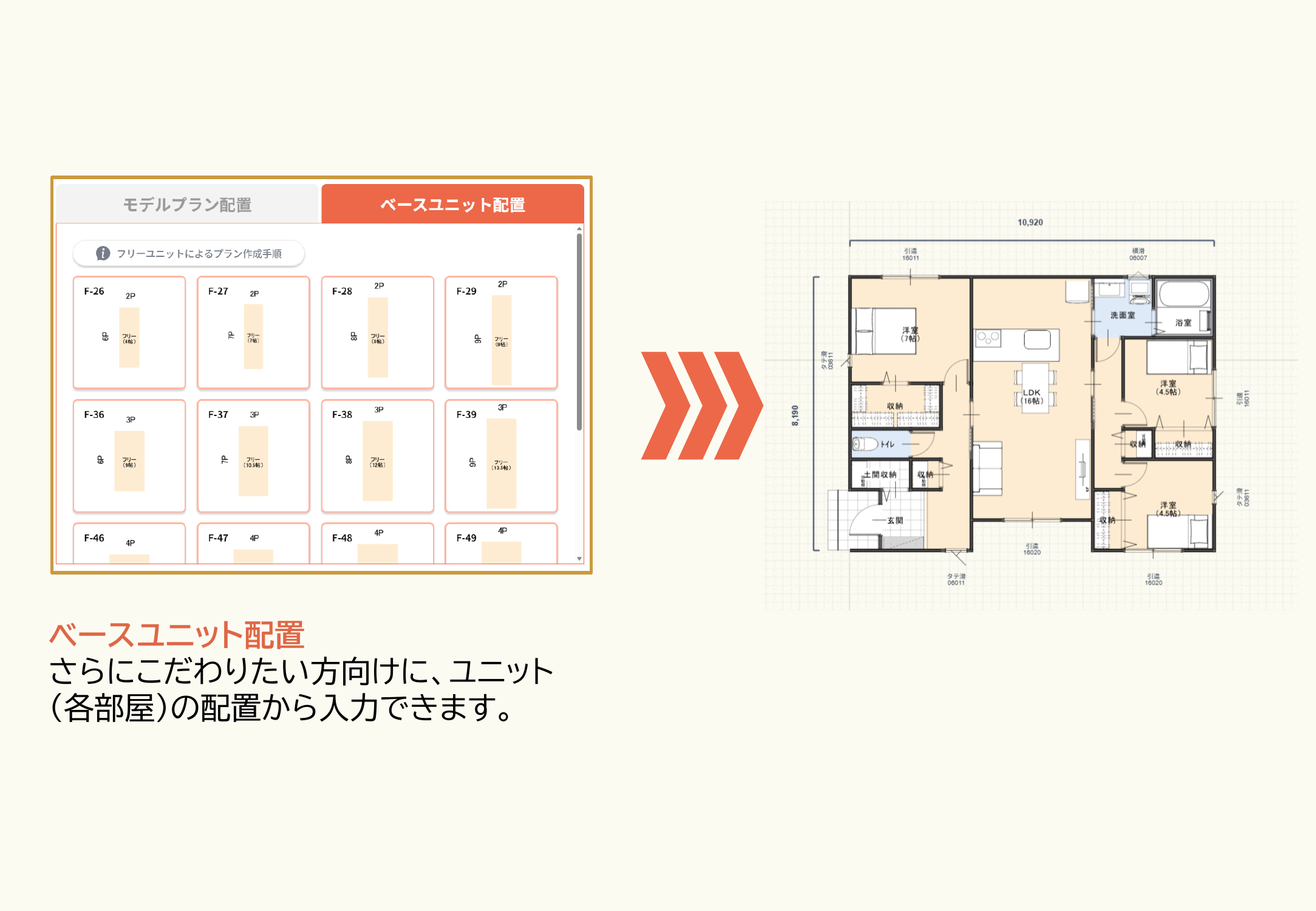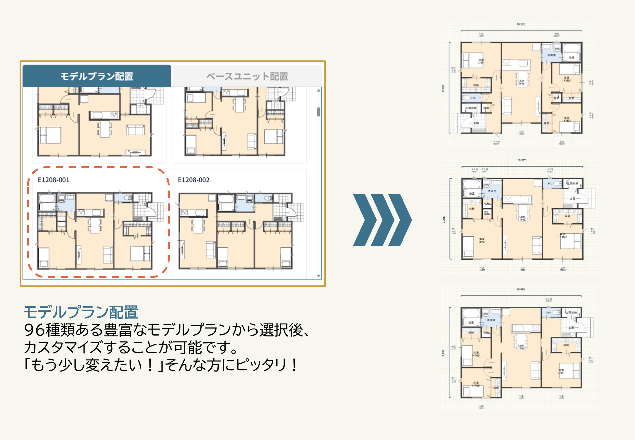 1LDK〜5LDKの96種類ある豊富なモデルプランから、プランを選択し、必要に応じてユニットをカスタマイズして間取りを作成します。