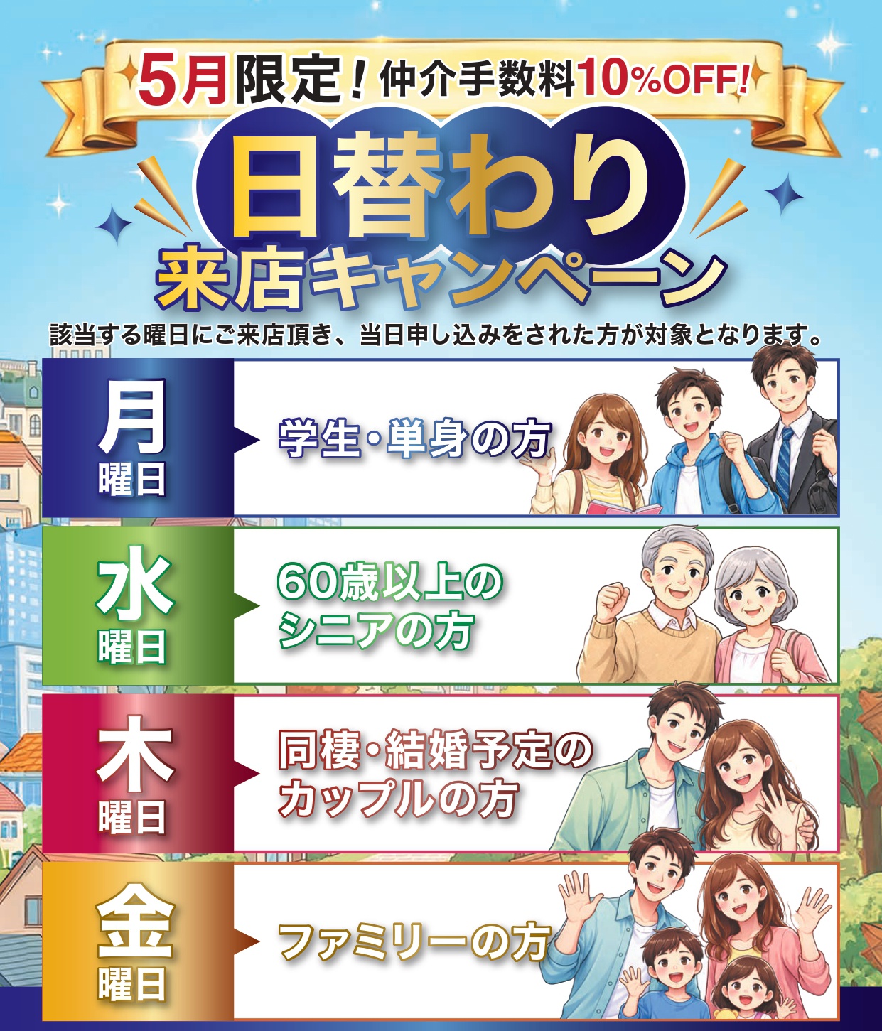 株式会社三福綜合不動産(愛媛県松山市)が運営する「アパマンショップ松山北店」「アパマンショップ松山南店」「アパマンショップ松山国道11号店」の3店舗では、2026年5月限定で「日替わり来店キャンペーン」を実施します。曜日ごとに対象となる方が変わり、該当日に来店・当日申込を行った方を対象に、仲介手数料を10%割引します。