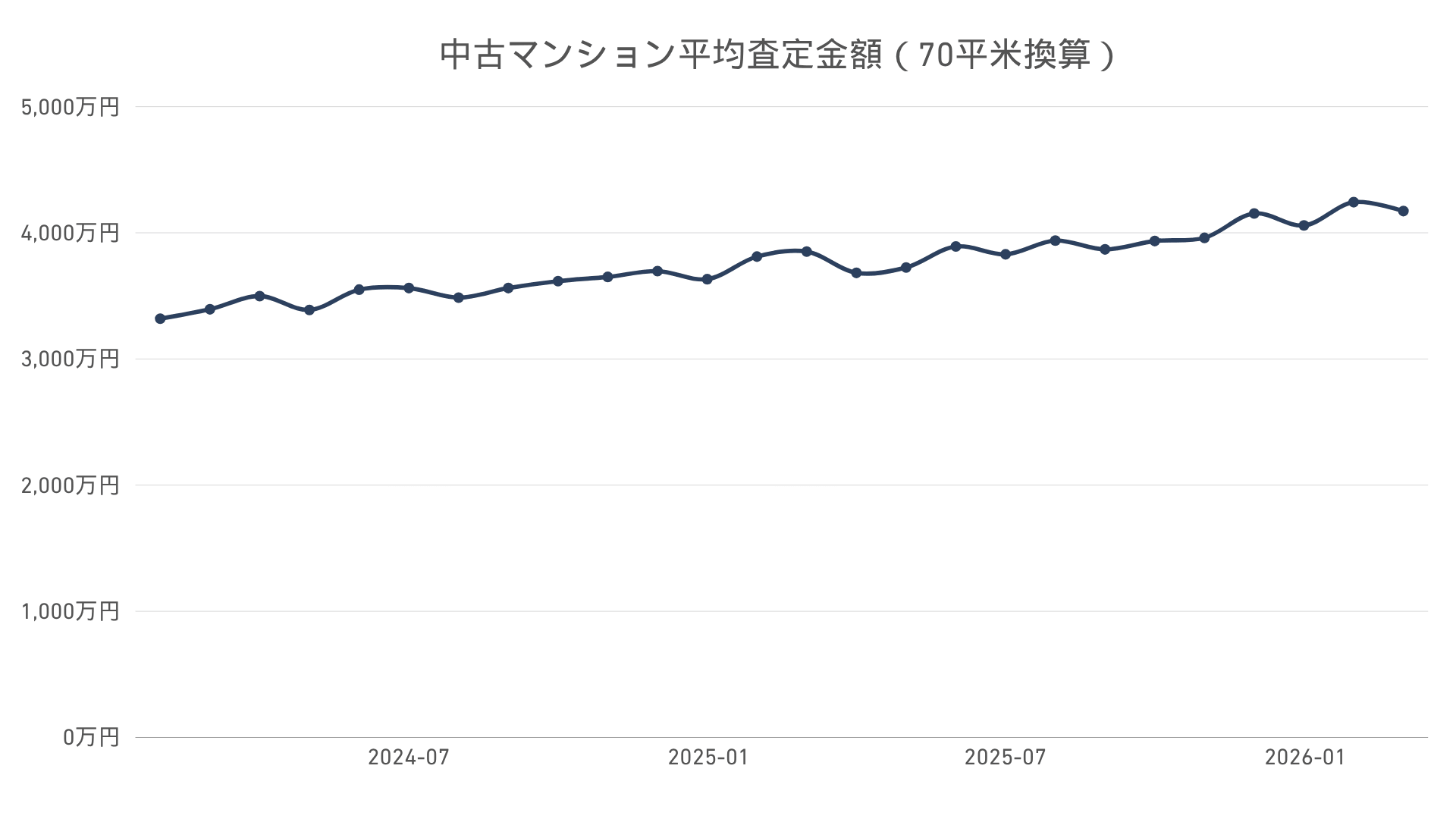 ツナガルオンライン査定を利用した全国の中古マンション平均査定金額(70平米換算)は、約2年間で(2024年5月から2026年2月)、3,389万円から4,243万円のおよそ25%の上昇を記録しています。