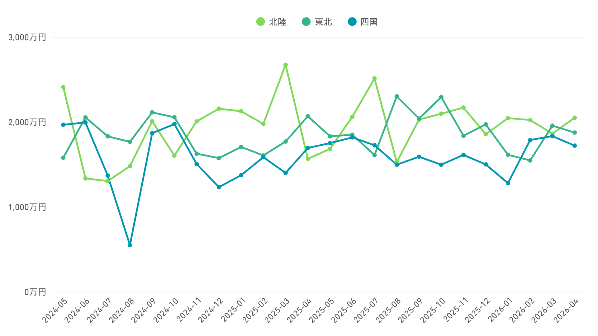 特に、全国地域での調査の結果、四国・東北・北陸の3地域での下落が確認されました。