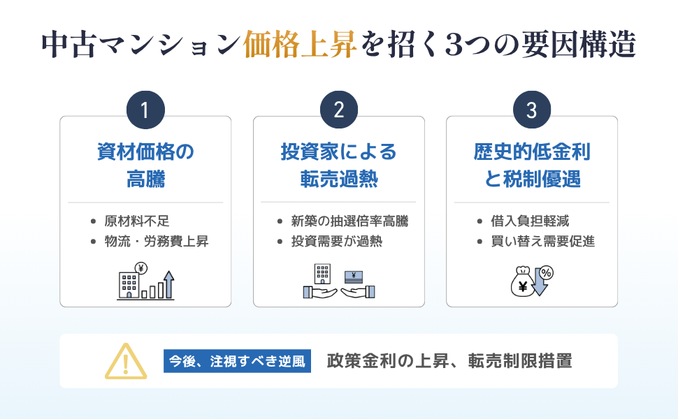 全国エリアでの不動産価格上昇を招く構造的要因は下記3点であると推定されています。