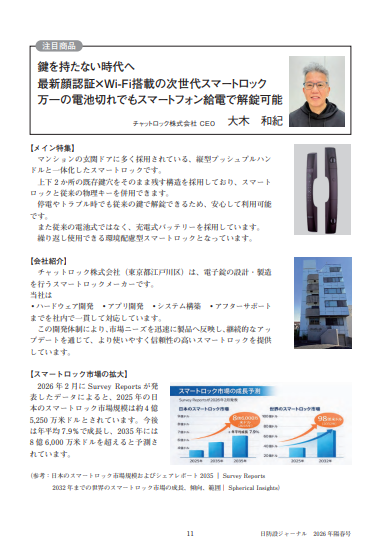 チャットロック株式会社(Chatlock)は、公益社団法人日本防犯設備協会が発行する専門誌「日防設ジャーナル(2026年 陽春号)」において、フラッグシップスマートロック「Chatlock」が「注目商品」として紹介されたことをお知らせいたします。