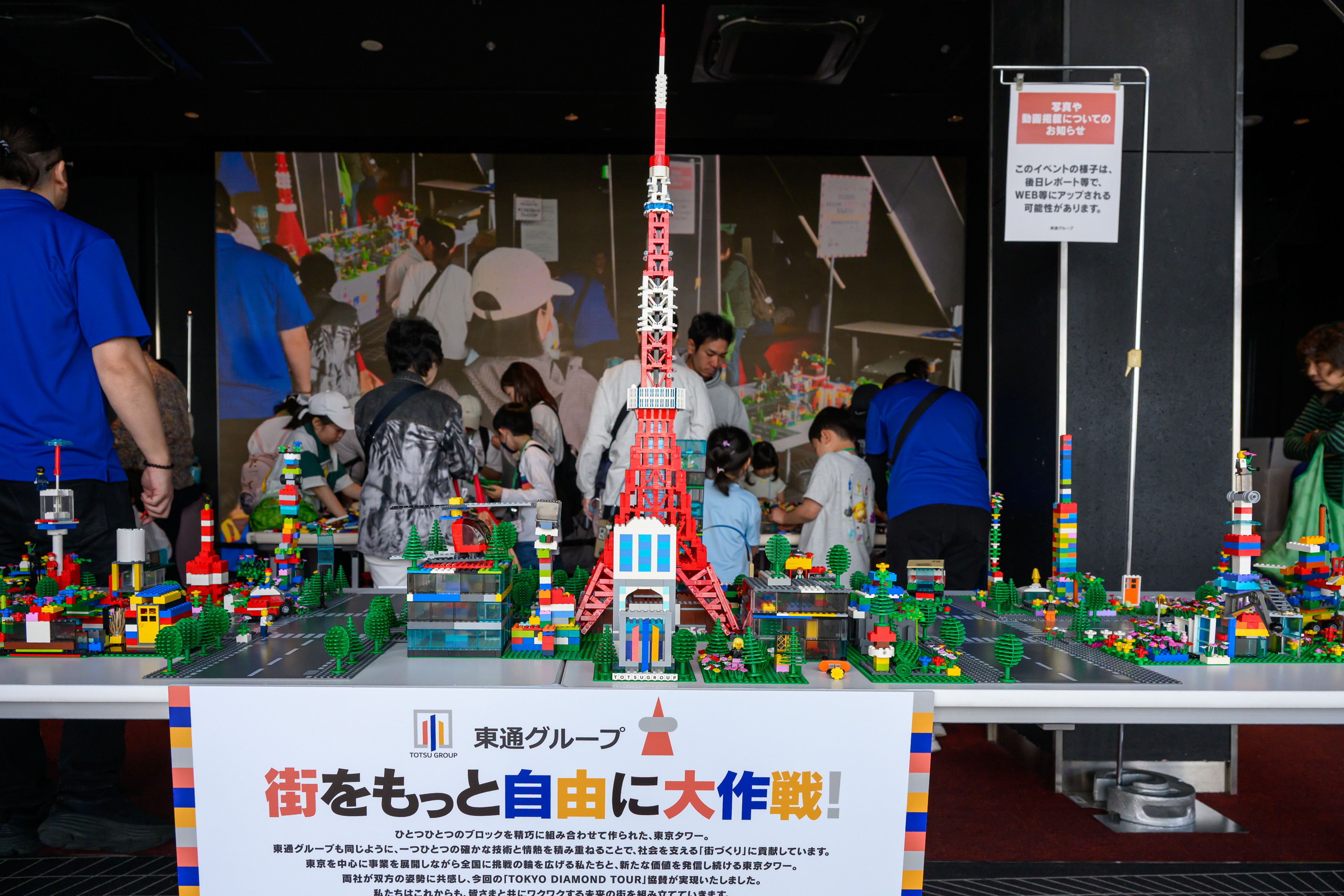 東通グループは昨年、「不動産をもっと自由に大作戦」プロジェクトを始動し、これまで不動産開発やホテル事業など、多岐にわたる分野での街づくりを行ってきましたが、今回初めて子どもたちを対象とした「遊びを通して未来の街づくりを学ぶ」体験型プログラムを行いました。また、東京タワーのプレミアムツアー「TOKYO DIAMOND TOUR」への協賛などを通じ、都市としての価値向上にも積極的に取り組んでいます。本イベントは、子どもたちの自由な発想を引き出し、未来の街づくりに対する想像力を育むことを目的としたものです。高さ150mから東京のパノラマを見渡す絶好のロケーションの中、レゴ®ブロックの建物を作り、街を完成させるビルディングエリアや、レゴ®エデュケーションアカデミー ティーチャートレーナー(以下、レゴ社認定講師)の元、「街をもっと自由に大作戦!」をテーマにモデル制作に挑戦するワークショップなど、多くの子どもたちがレゴ®エデュケーションを活用したプログラムに参加し、笑顔あふれる一日となりました。